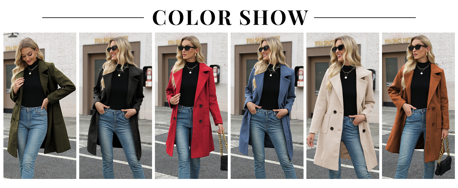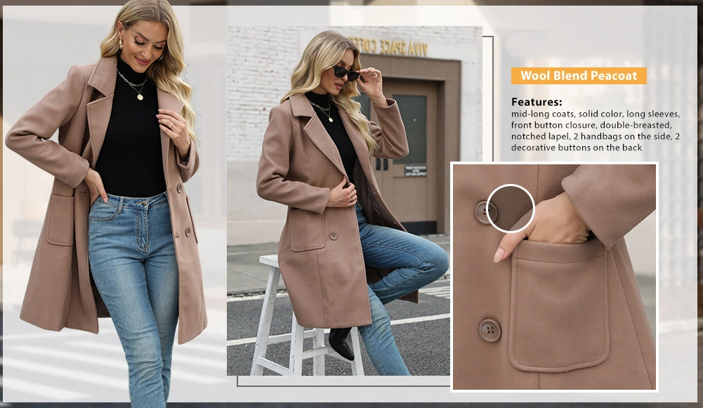 - Women mid-long coats, solid color, long sleeves, front button closure, double-breasted, notched lapel, 2 handbags on the side, 2 decorative buttons on the back.