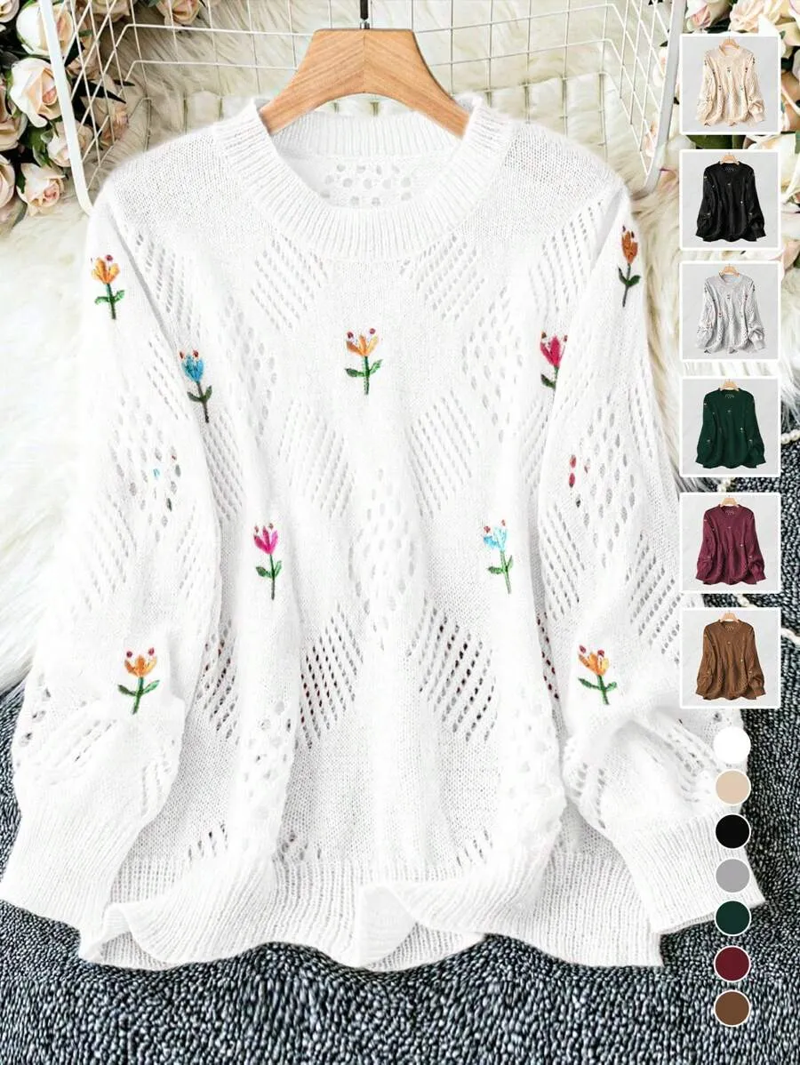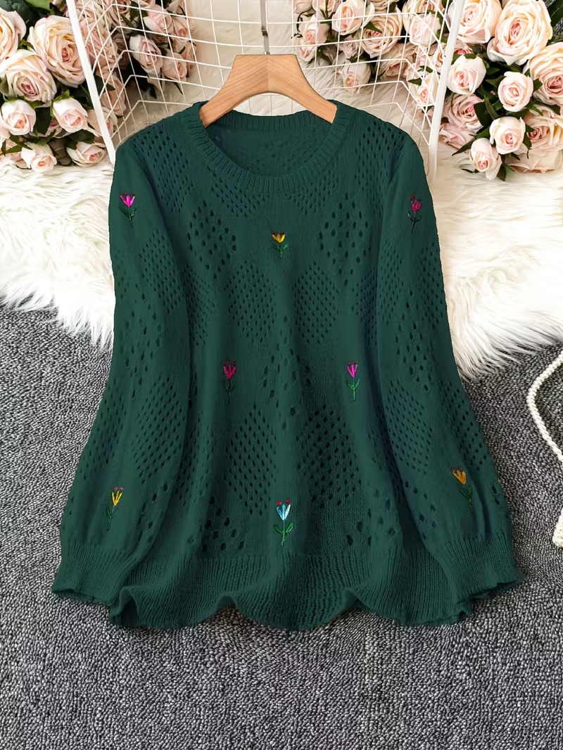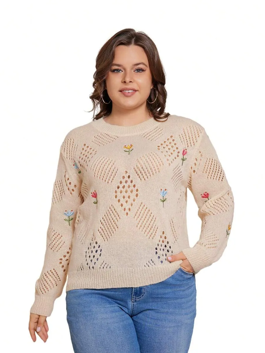 Plus Size Round Neck Floral Embroidery Hollow Out Casual Sweater, Stylish Women's Pullover for Spring & Fall Fashion