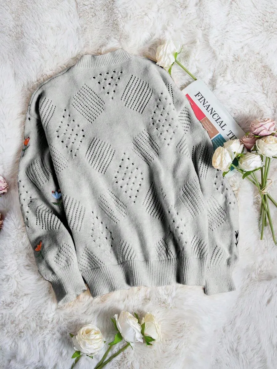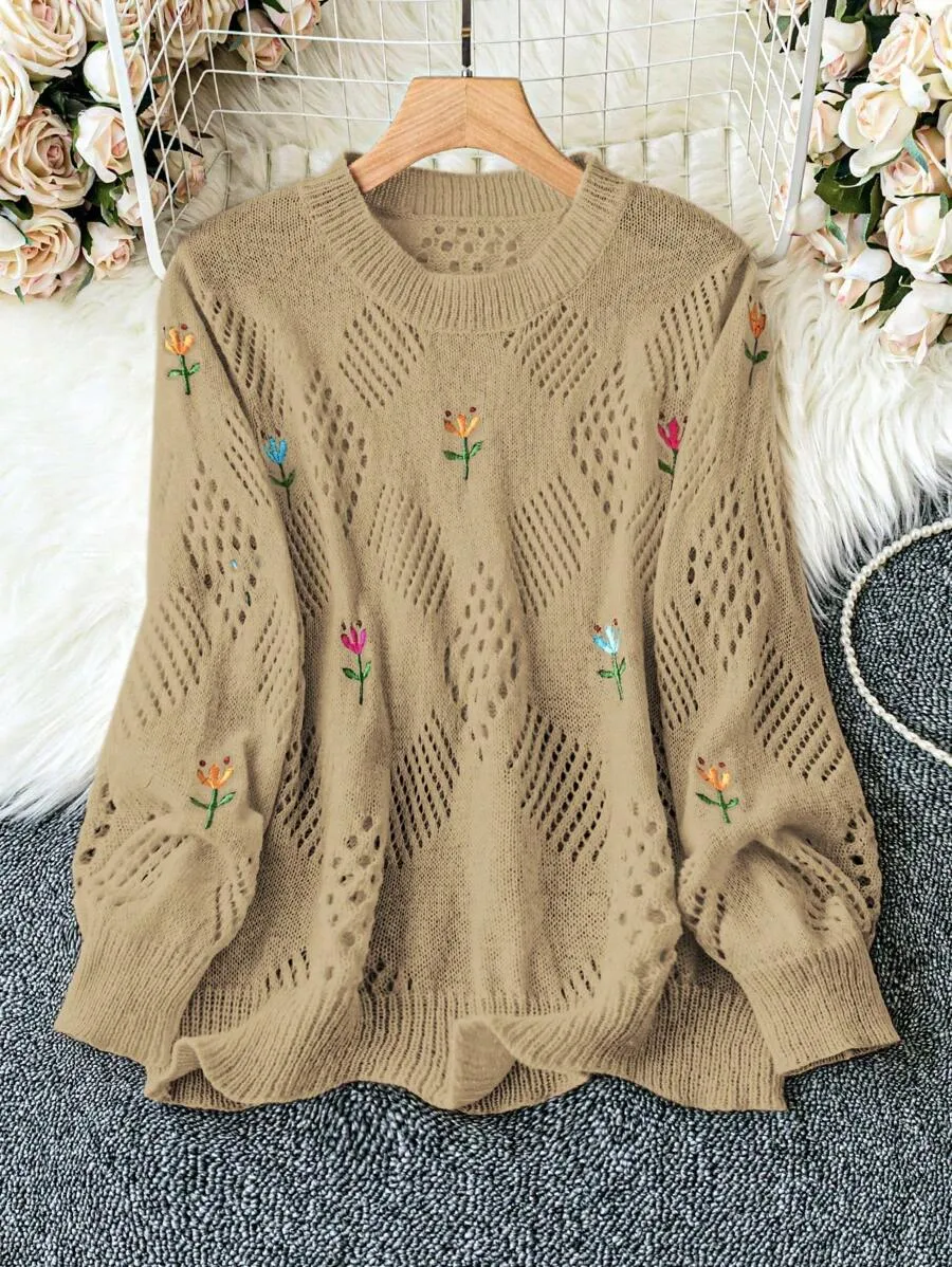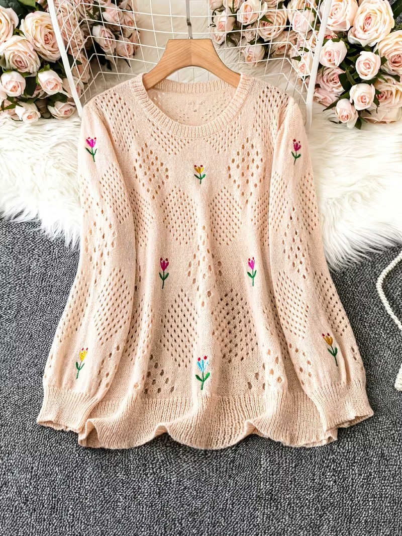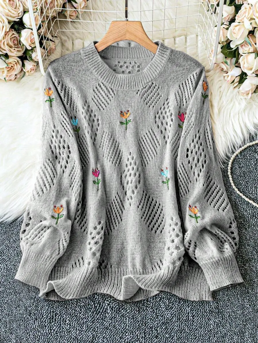 Plus Size Round Neck Floral Embroidery Hollow Out Casual Sweater, Stylish Women's Pullover for Spring & Fall Fashion