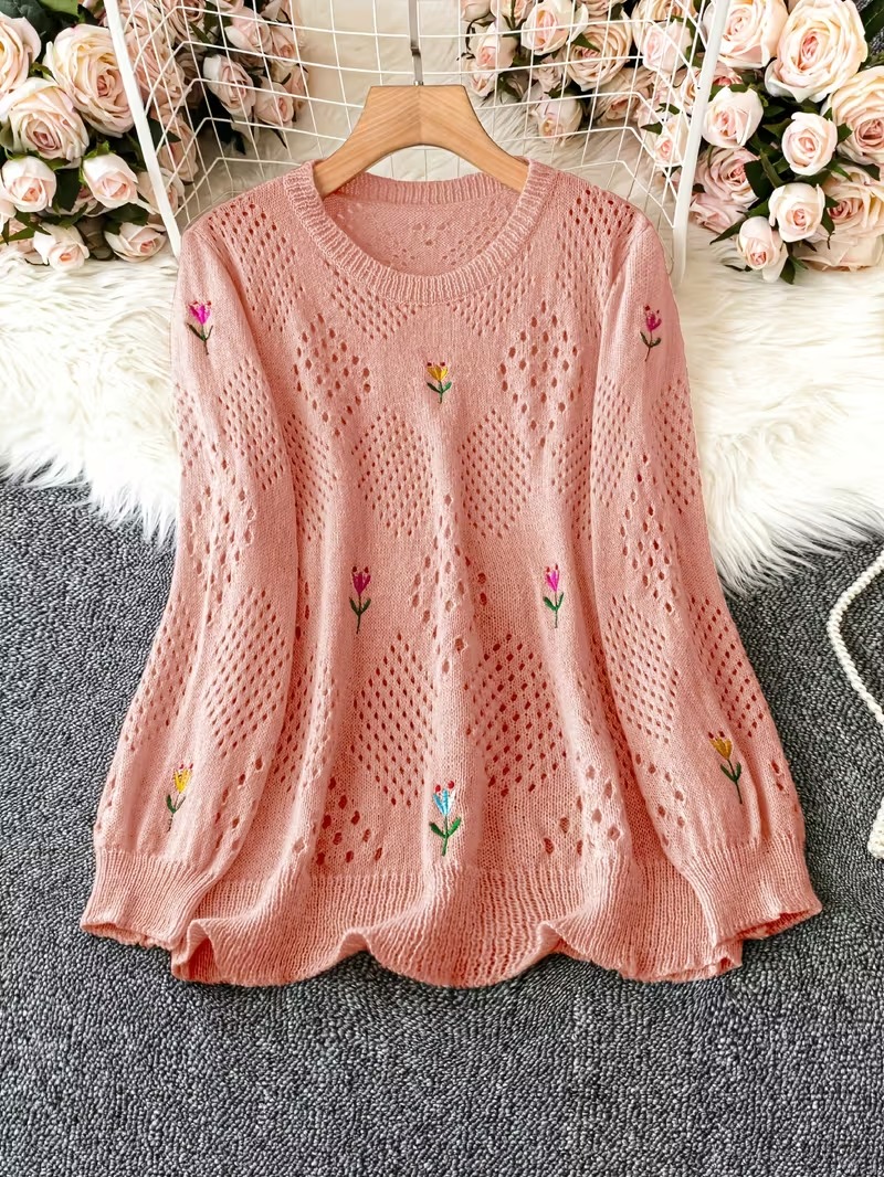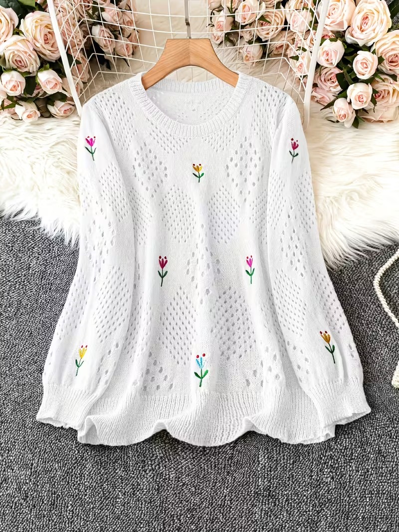 plus size floral embroidery sweater casual cut out long sleeve crew neck sweater for spring womens plus size clothing Product details 0