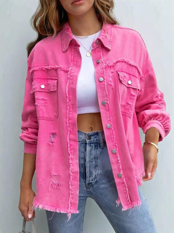 Women's Plain Button Front Ripped Drop Shoulder Coat, Casual Long Sleeve Shirt Collar Outerwear For Spring & Fall, Women's Clothes For Daily Wear, Denim Jacket