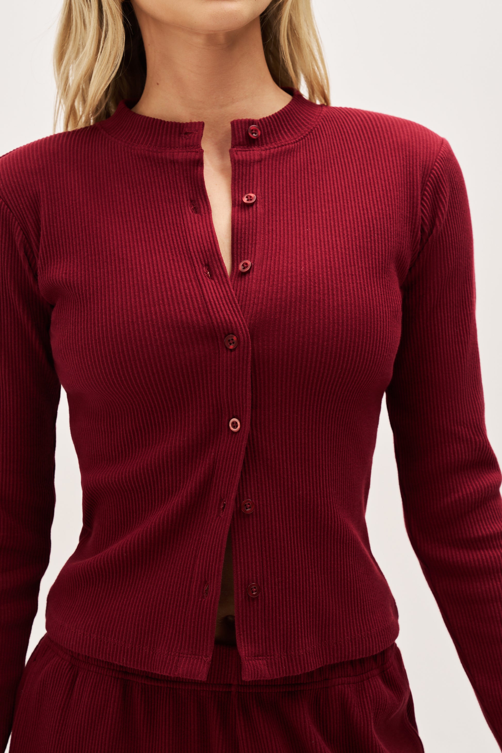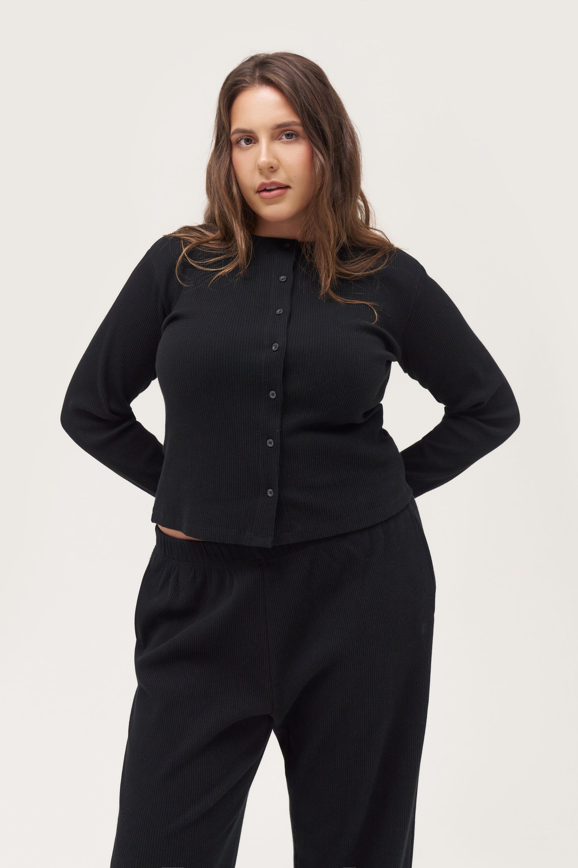 • Two-piece Set Women's Solid Button Front Ribbed Crop Top & Elastic Waist Pants, Casual Long Sleeve Round Neck Top & Trousers 2 Piece Set for Spring & Fall, Women's Clothes for Daily Wear