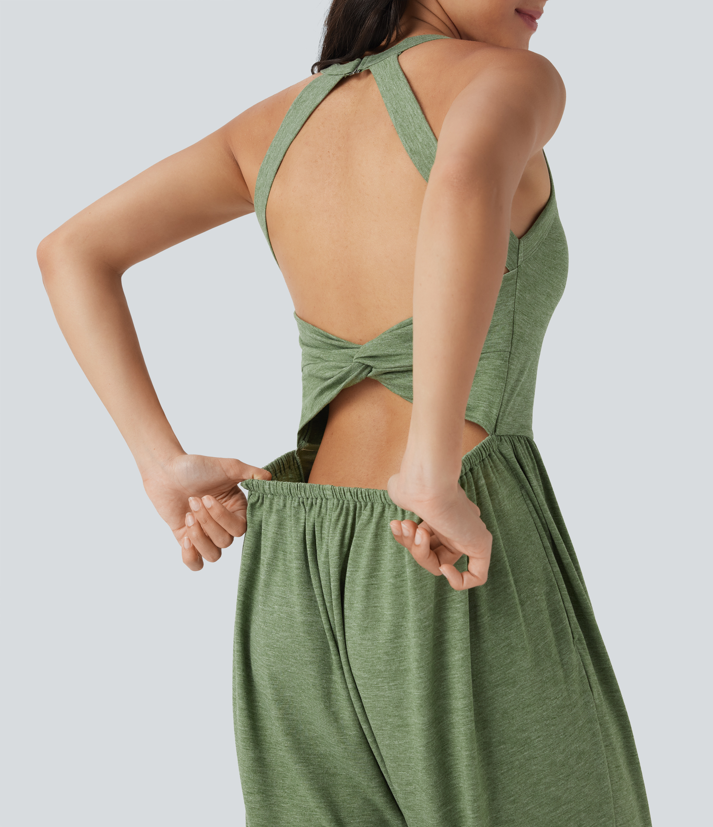 - Drop-crotch harem style jumpsuit for a casual, laid-back look.