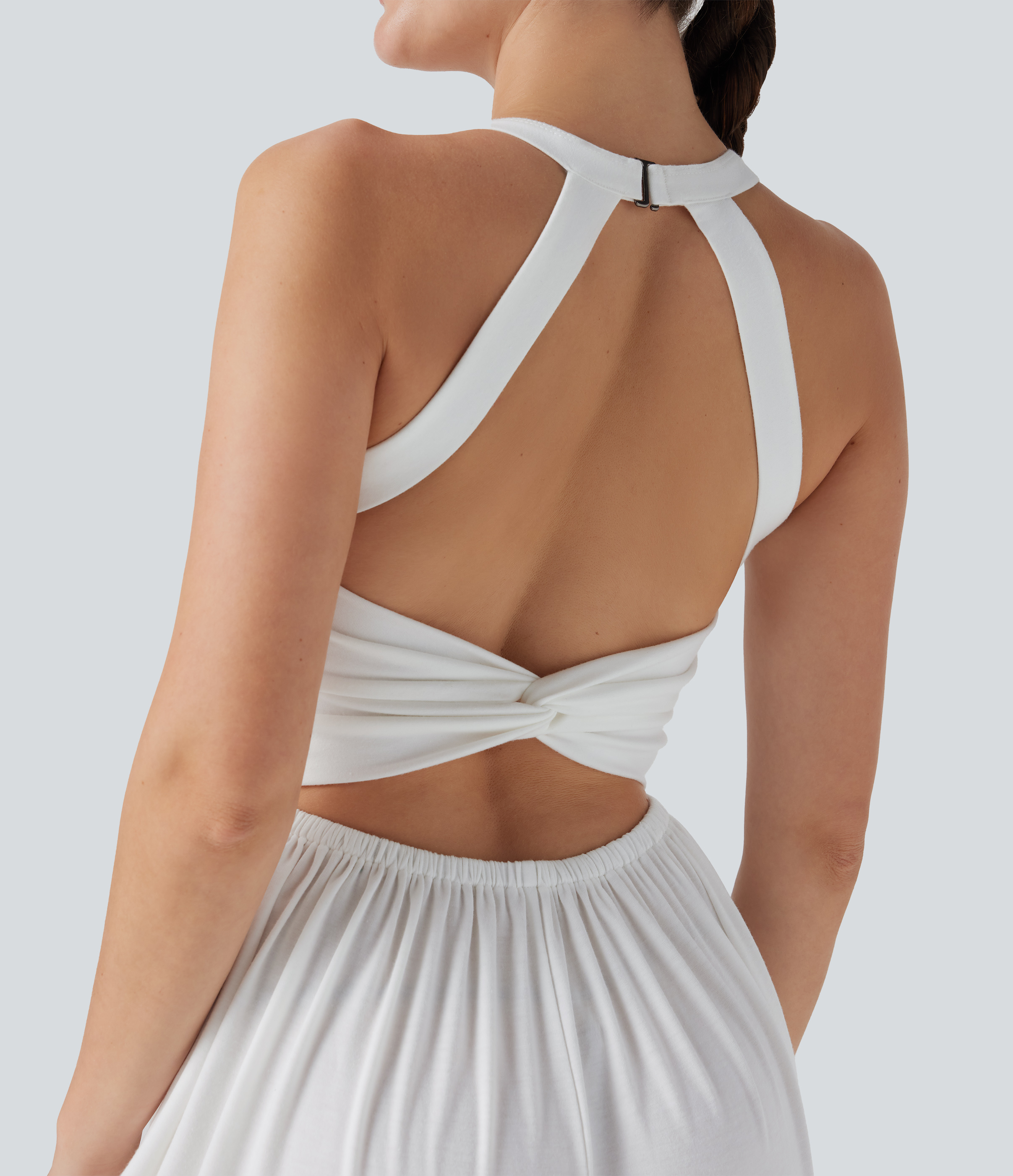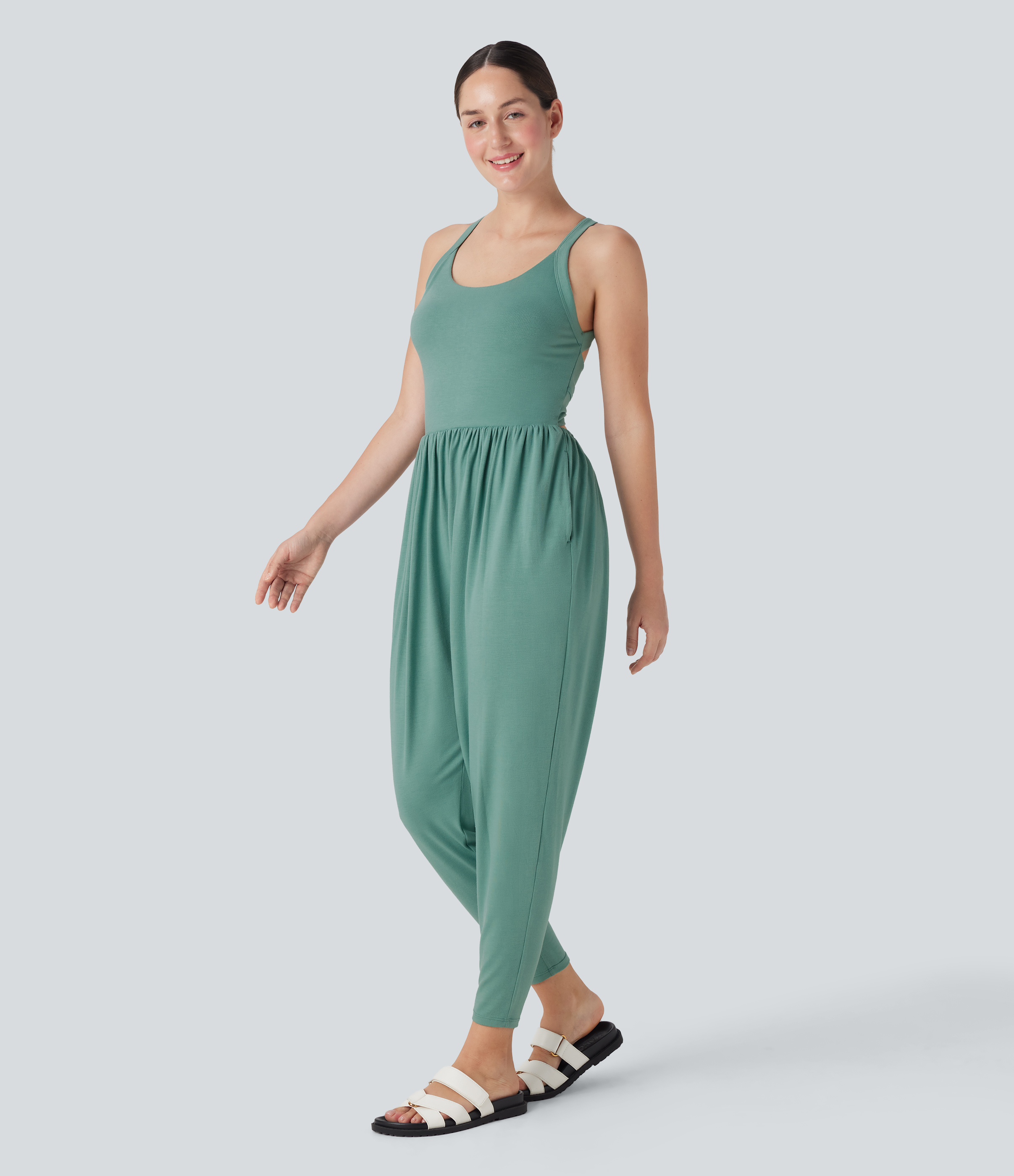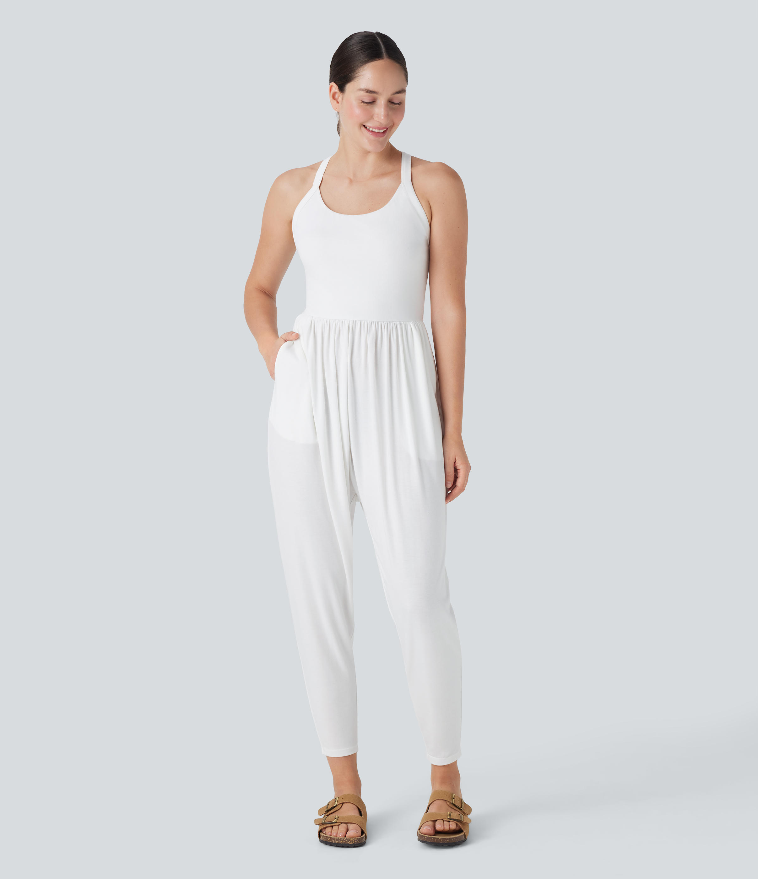 - Drop-crotch harem style jumpsuit for a casual, laid-back look.