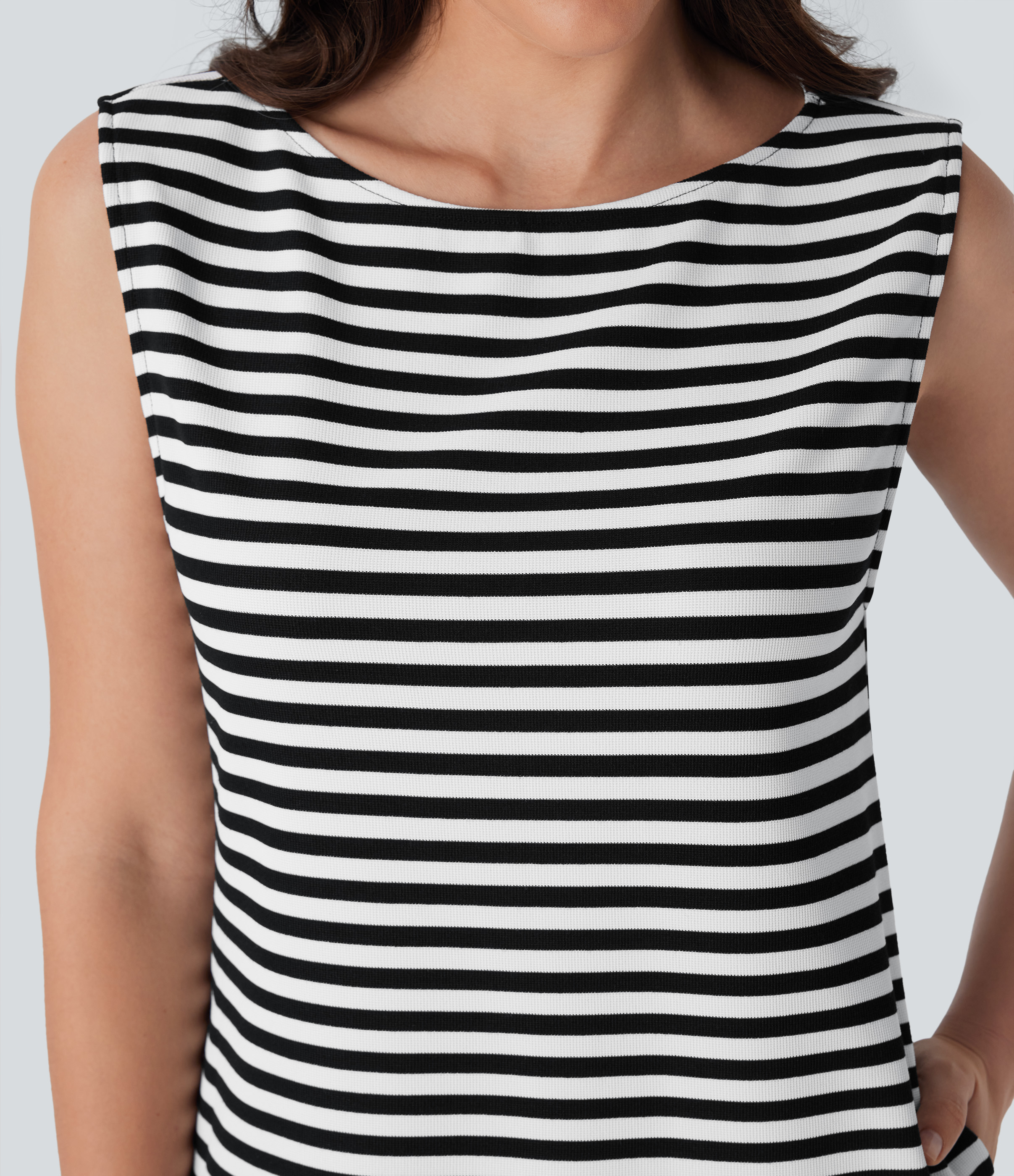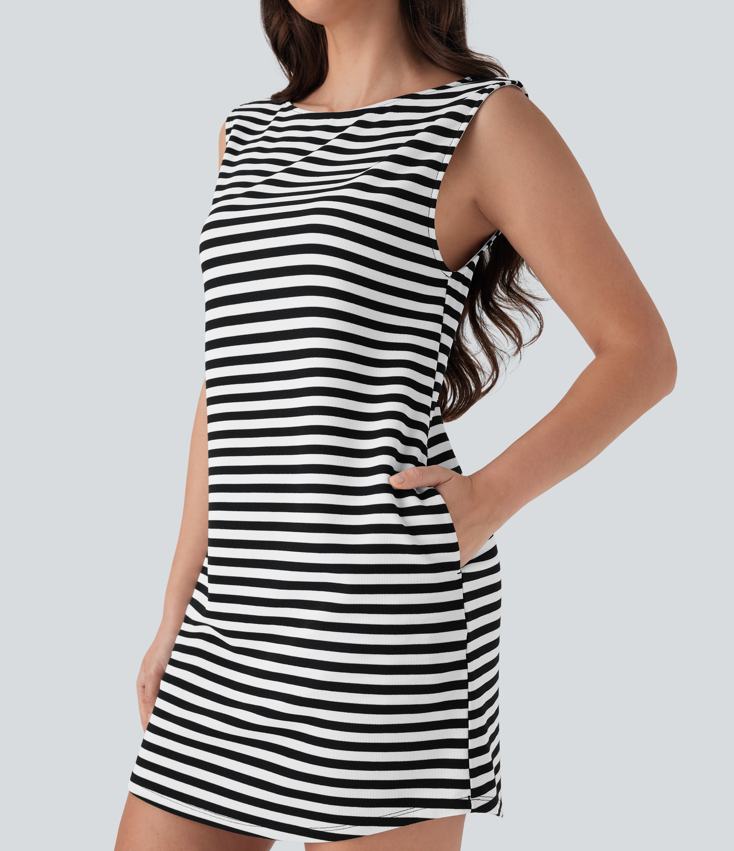 • Boat Neck Sleeveless Curved Hem Mini Stripe Waffle Casual Dress with Pockets