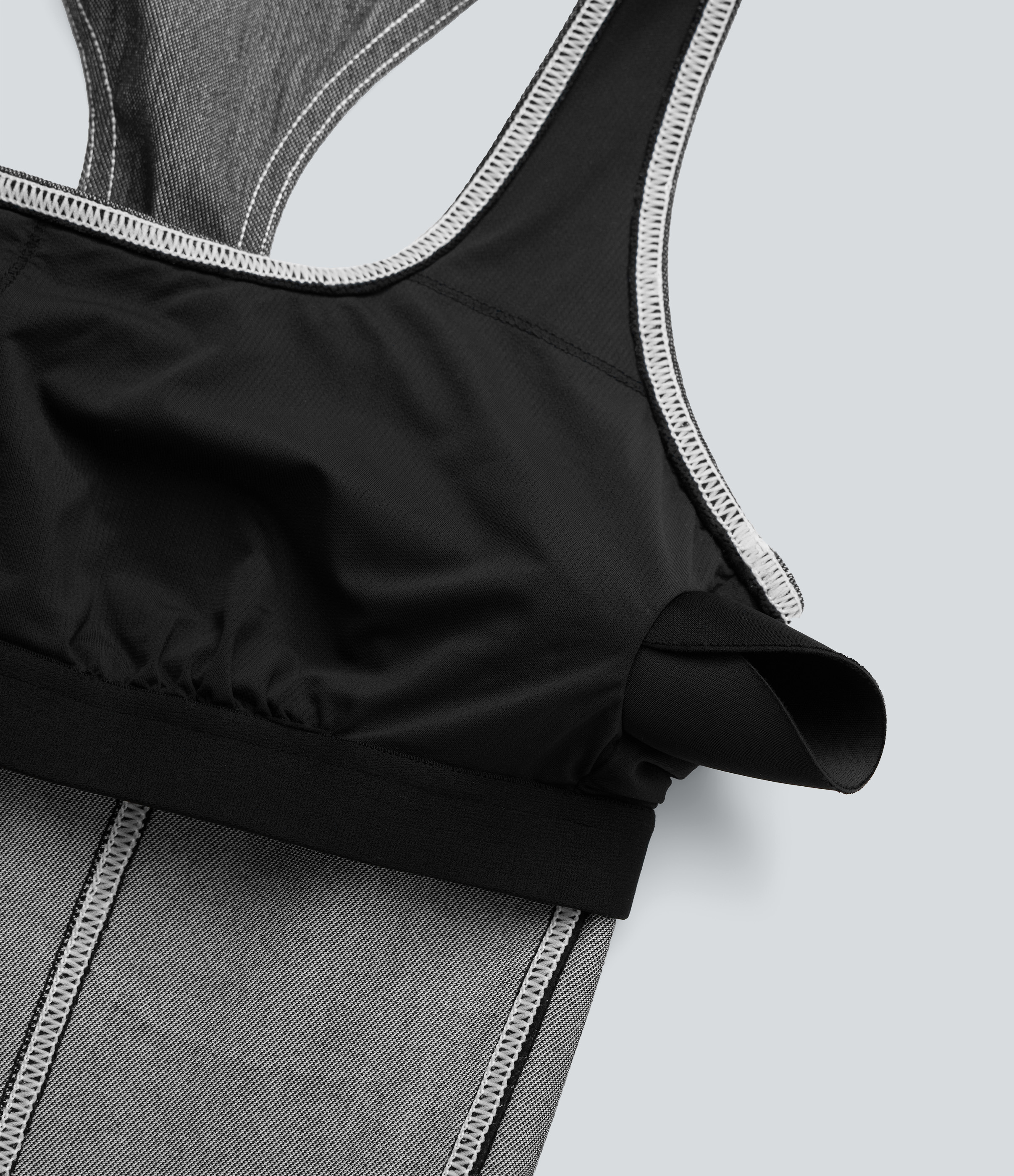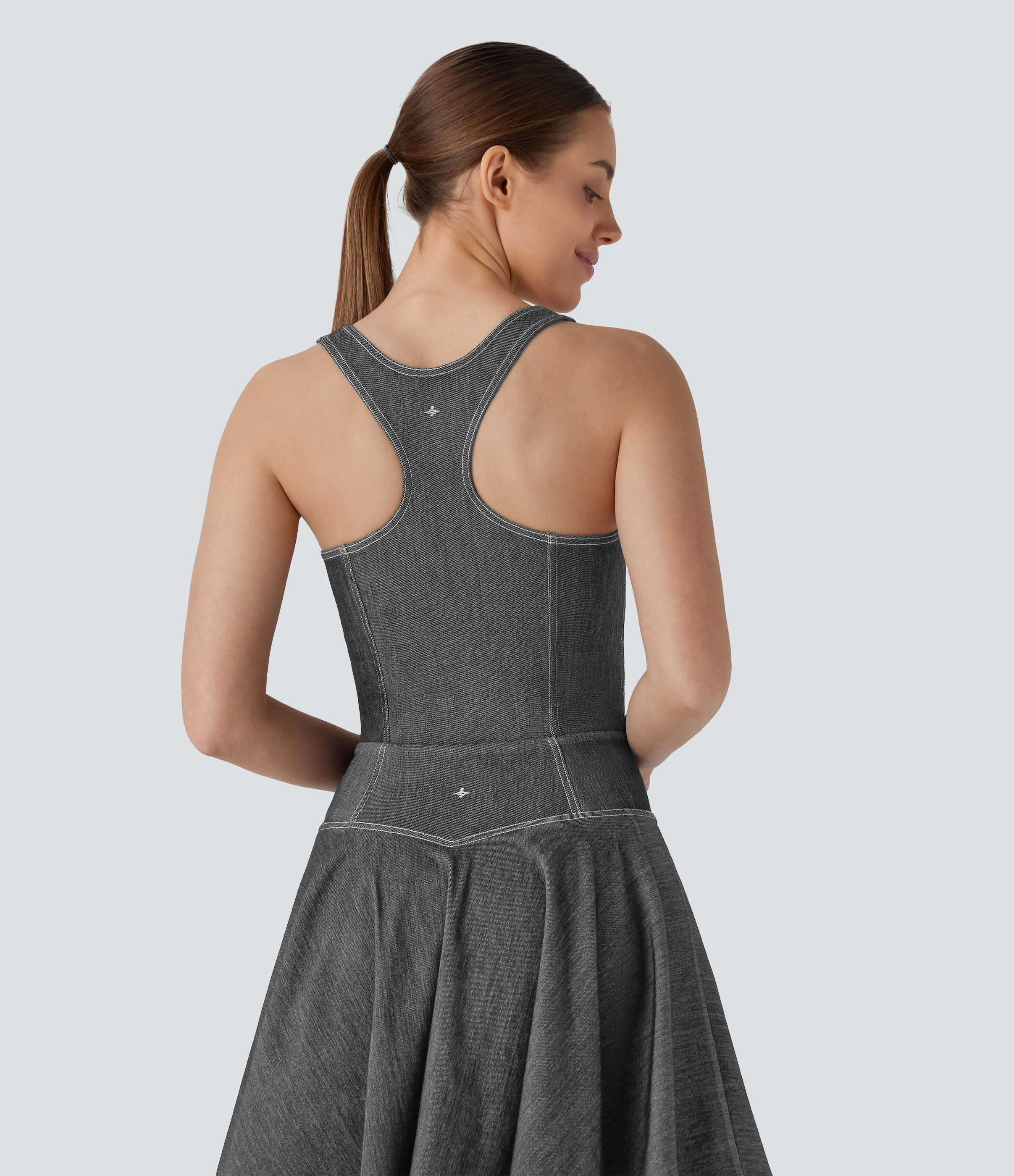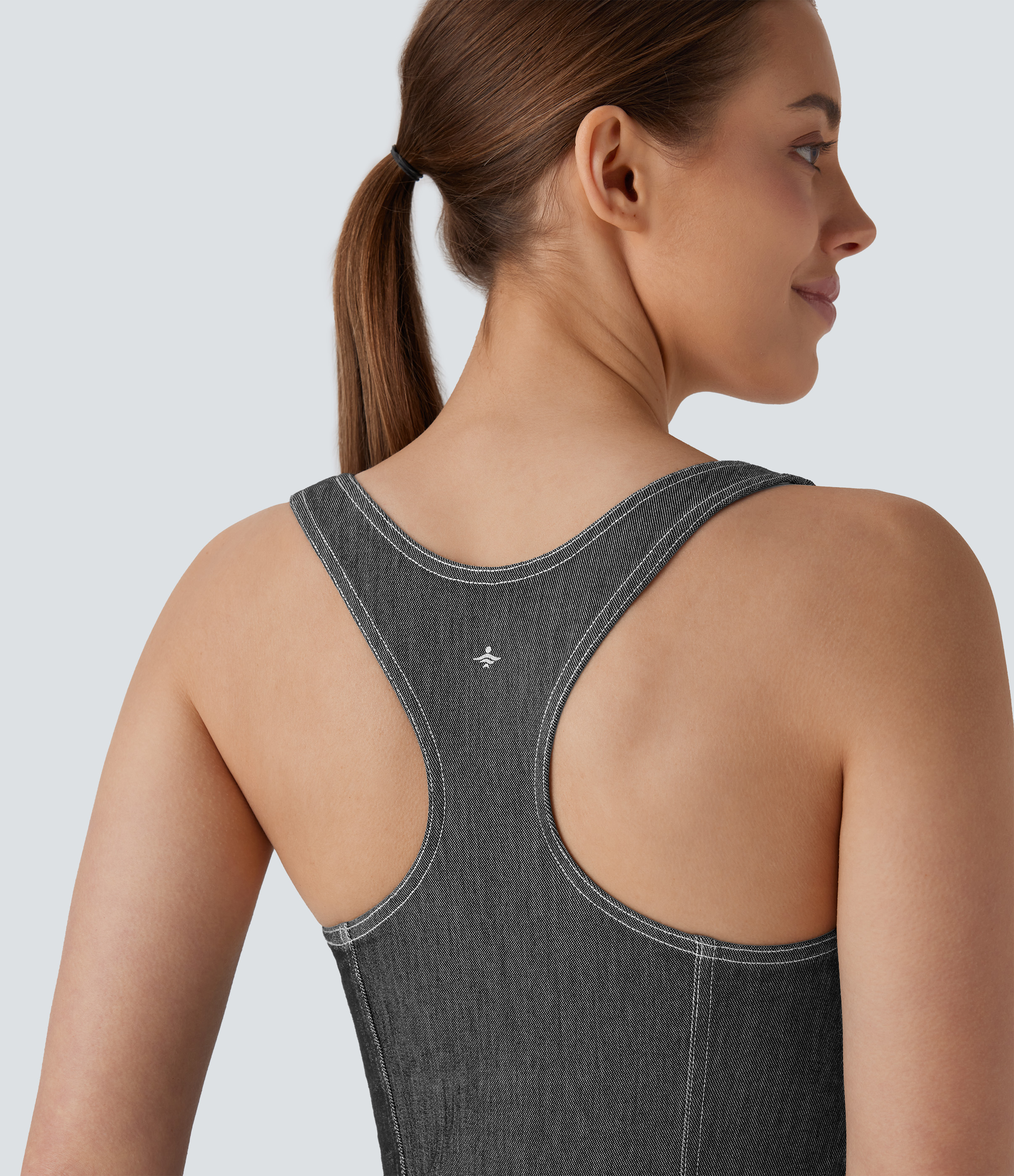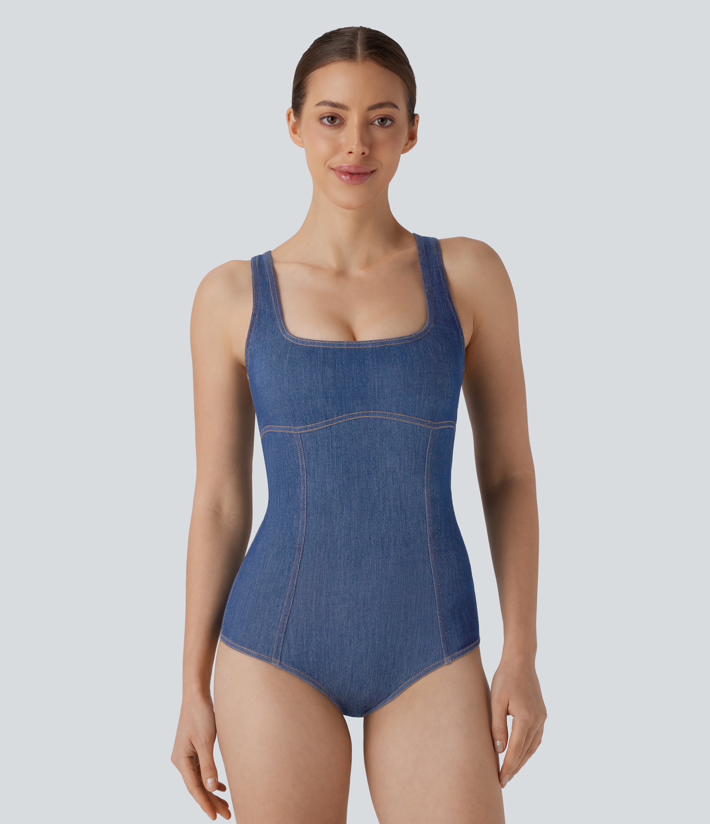• Halara FlexTM Square Neck Racerback Cool Touch Washed Denim Tennis Bodysuit