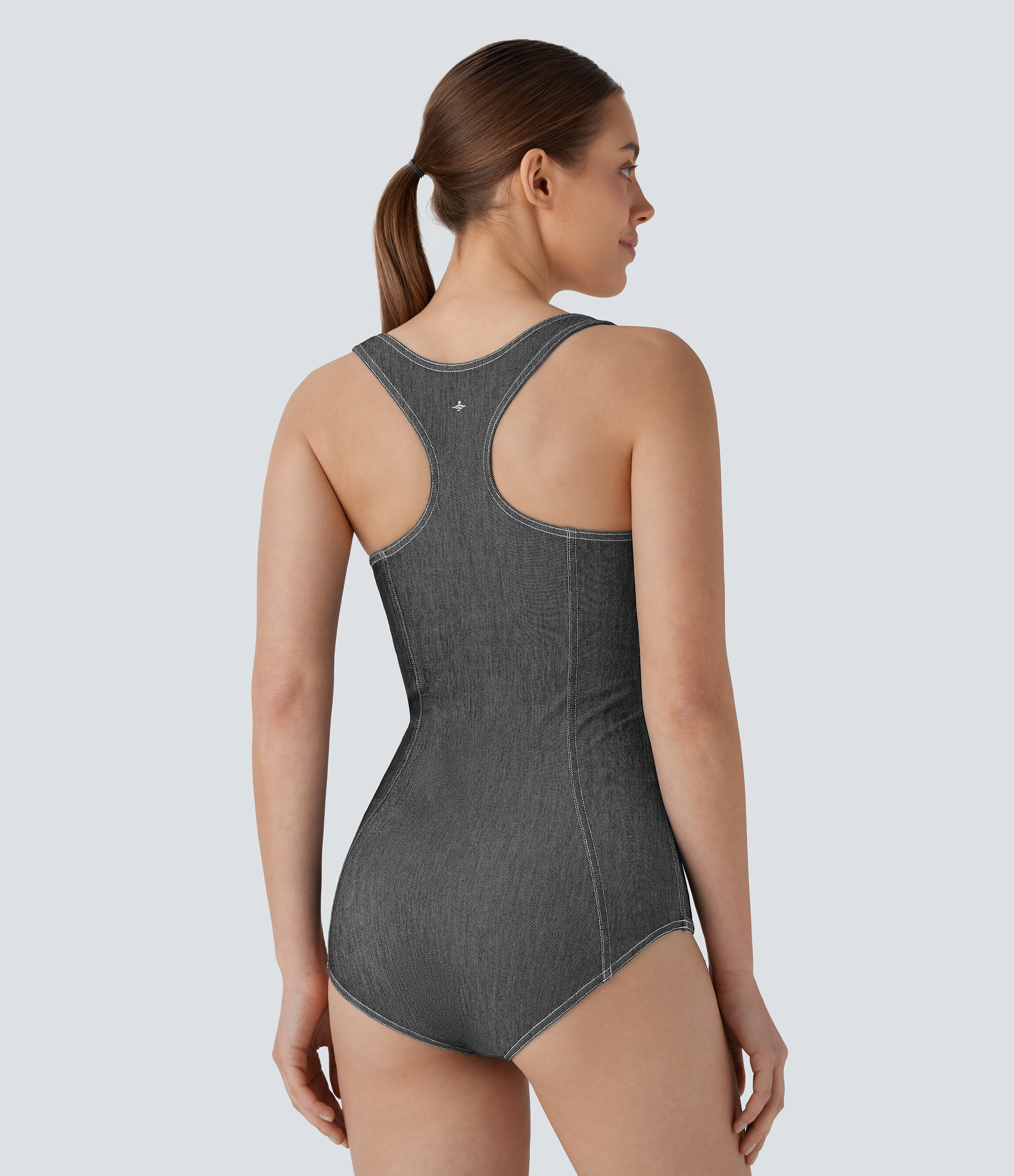 Halara FlexTM Square Neck Racerback Cool Touch Washed Denim Tennis Bodysuit