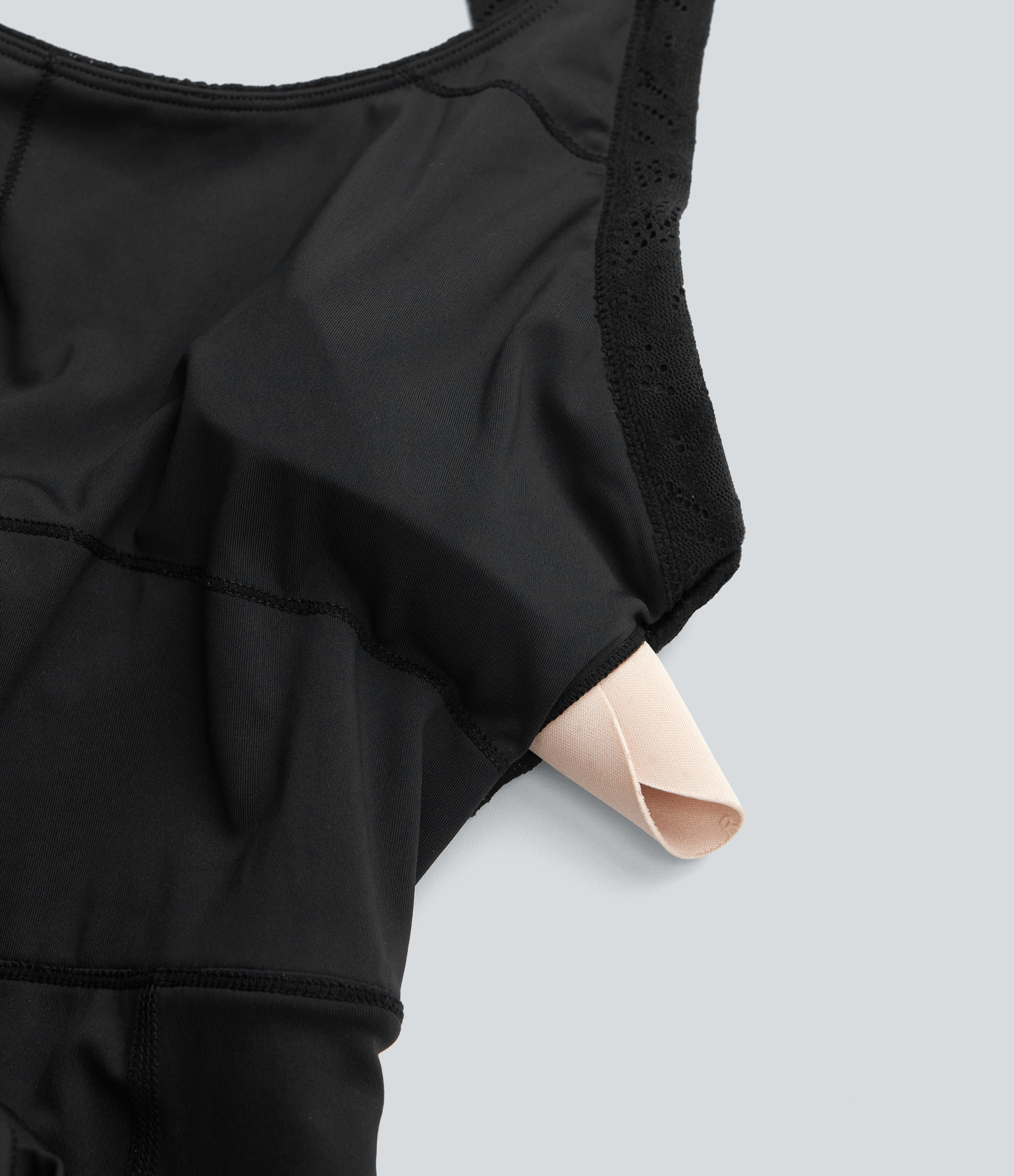 • Built-in shorts with open back waistband for easy peezy bathroom breaks.