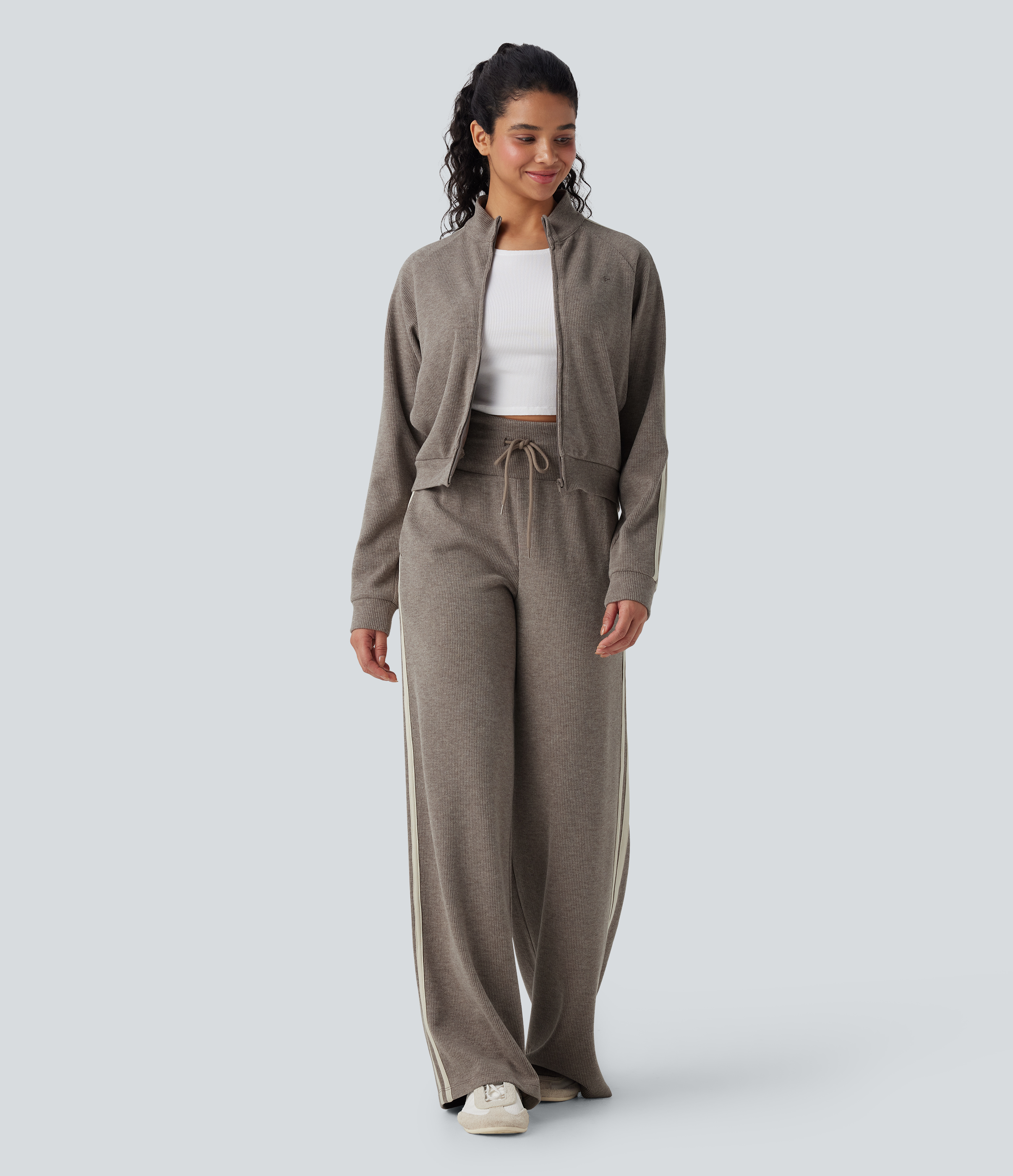 • Ribbed SoCinched High Waisted Tummy Control Drawstring Wide Leg Color Block Casual Pants with Pockets