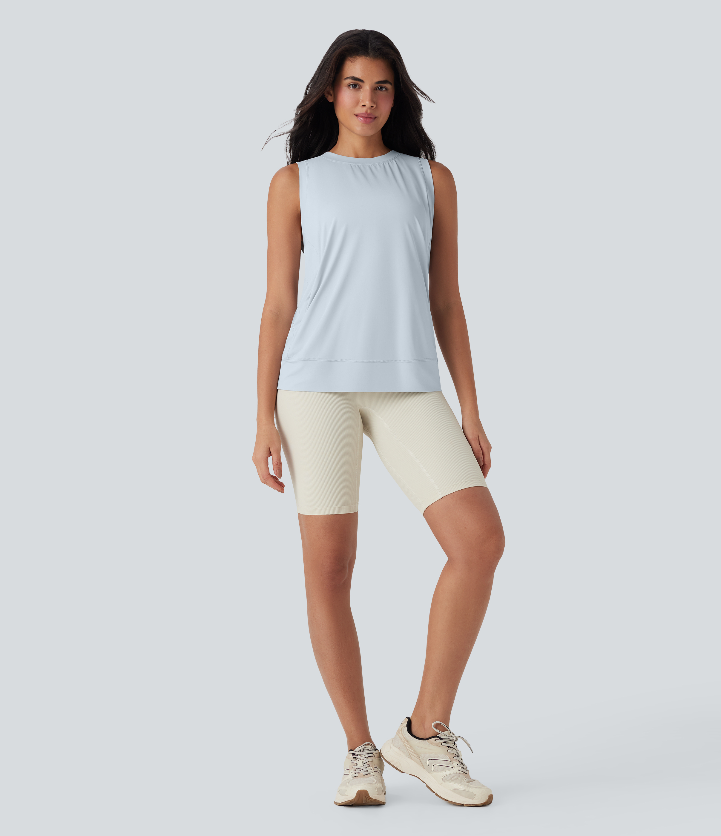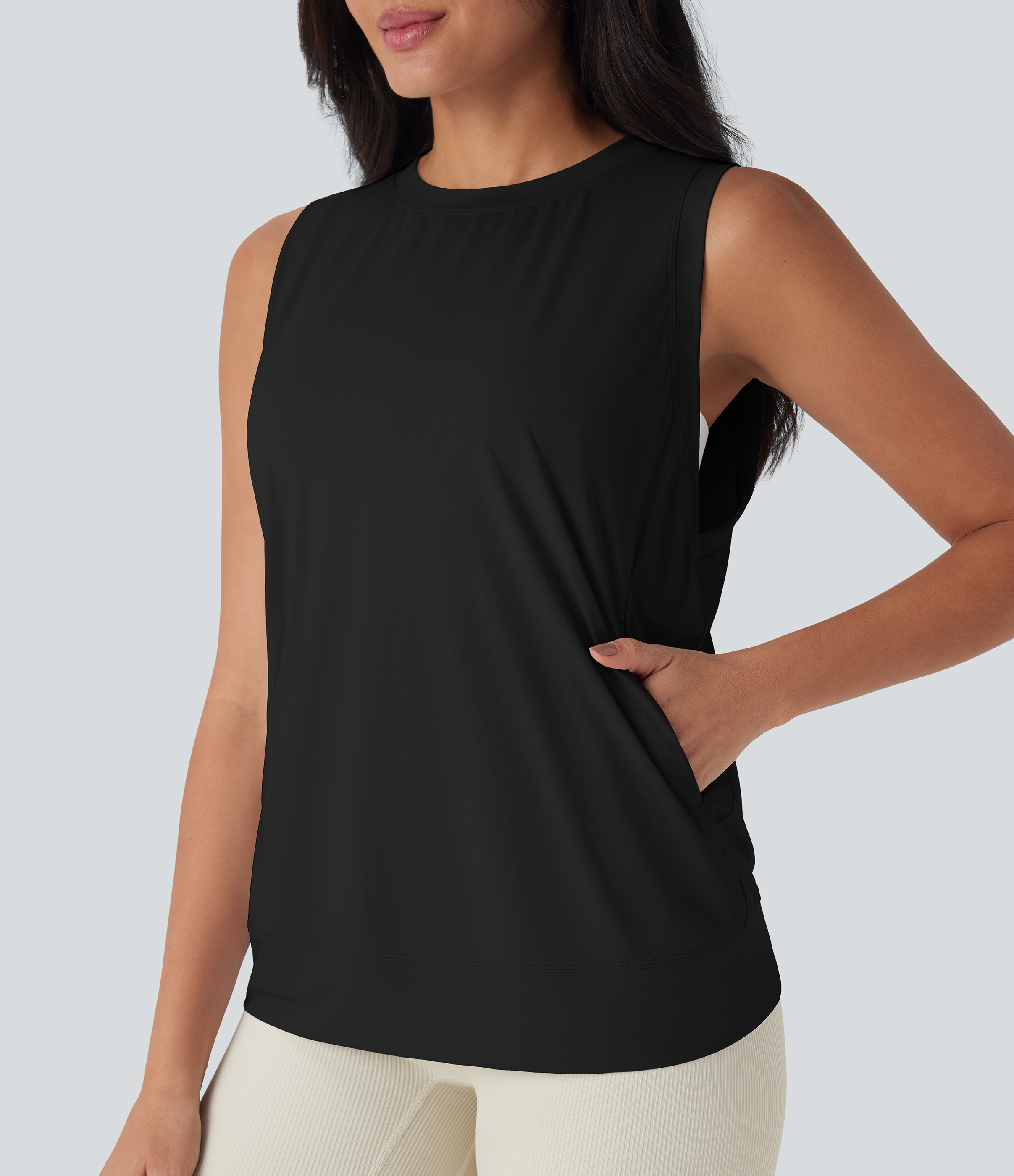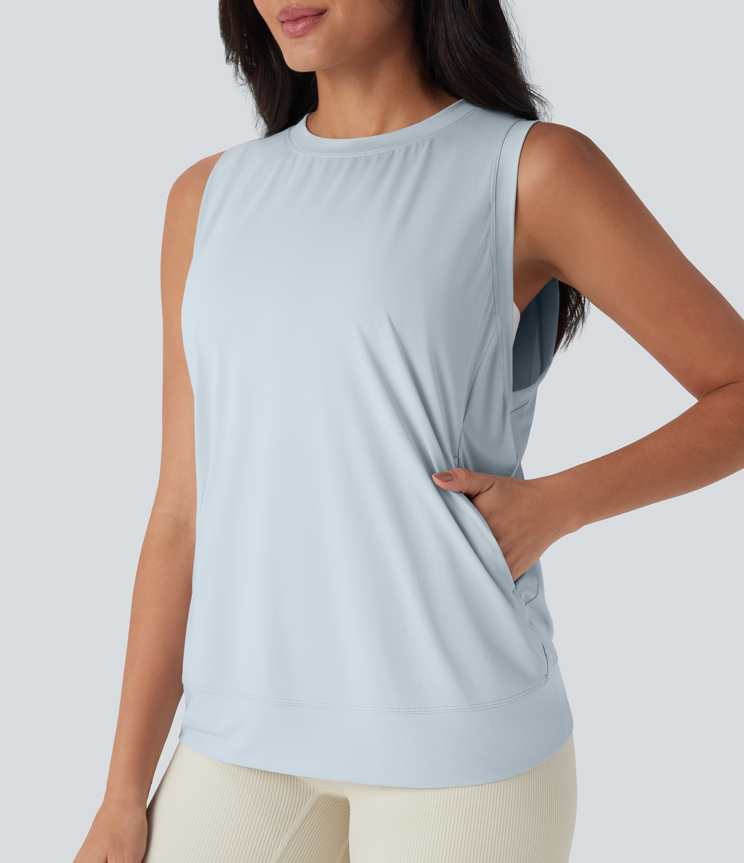 - Designed with a rounded neckline.