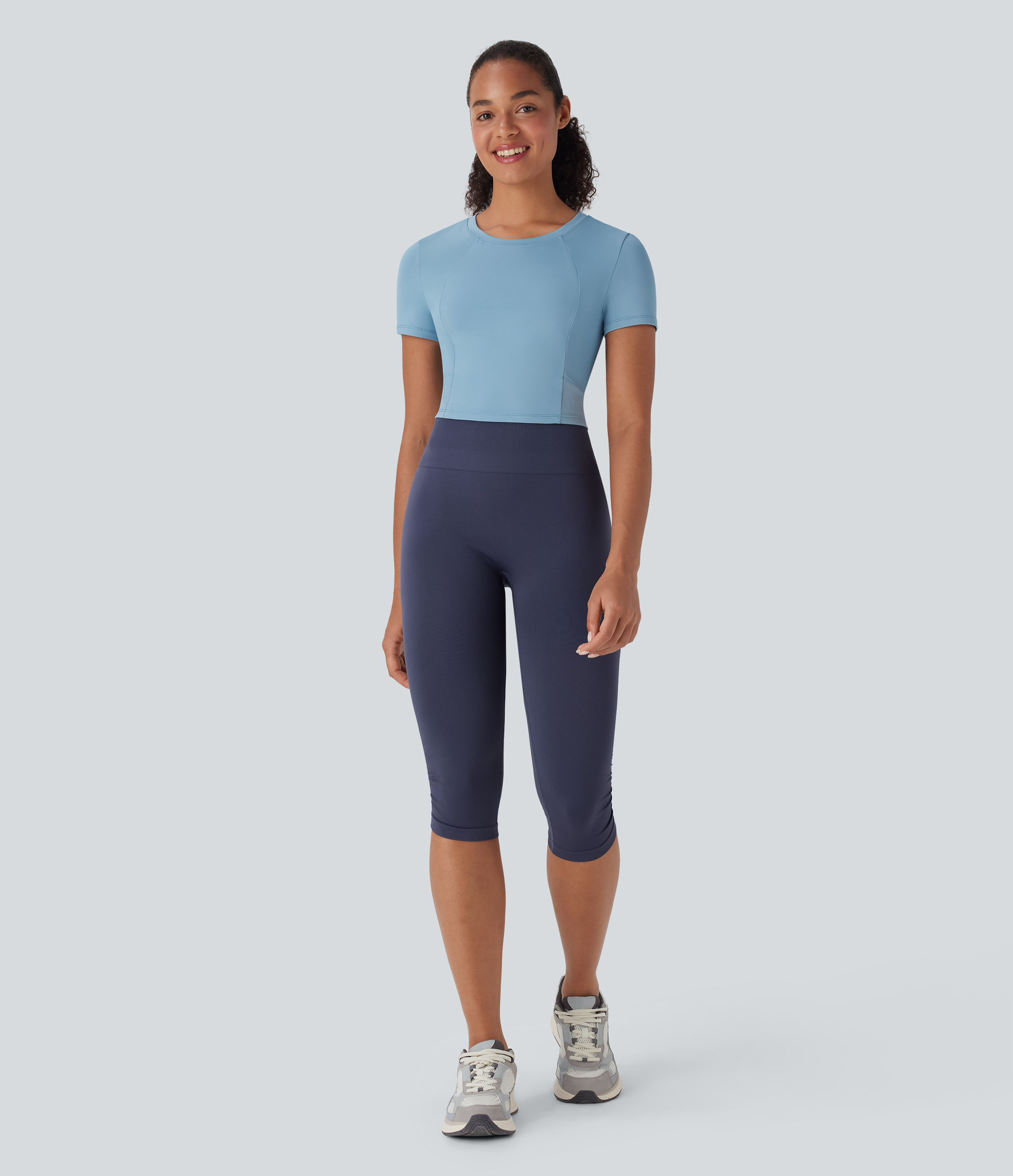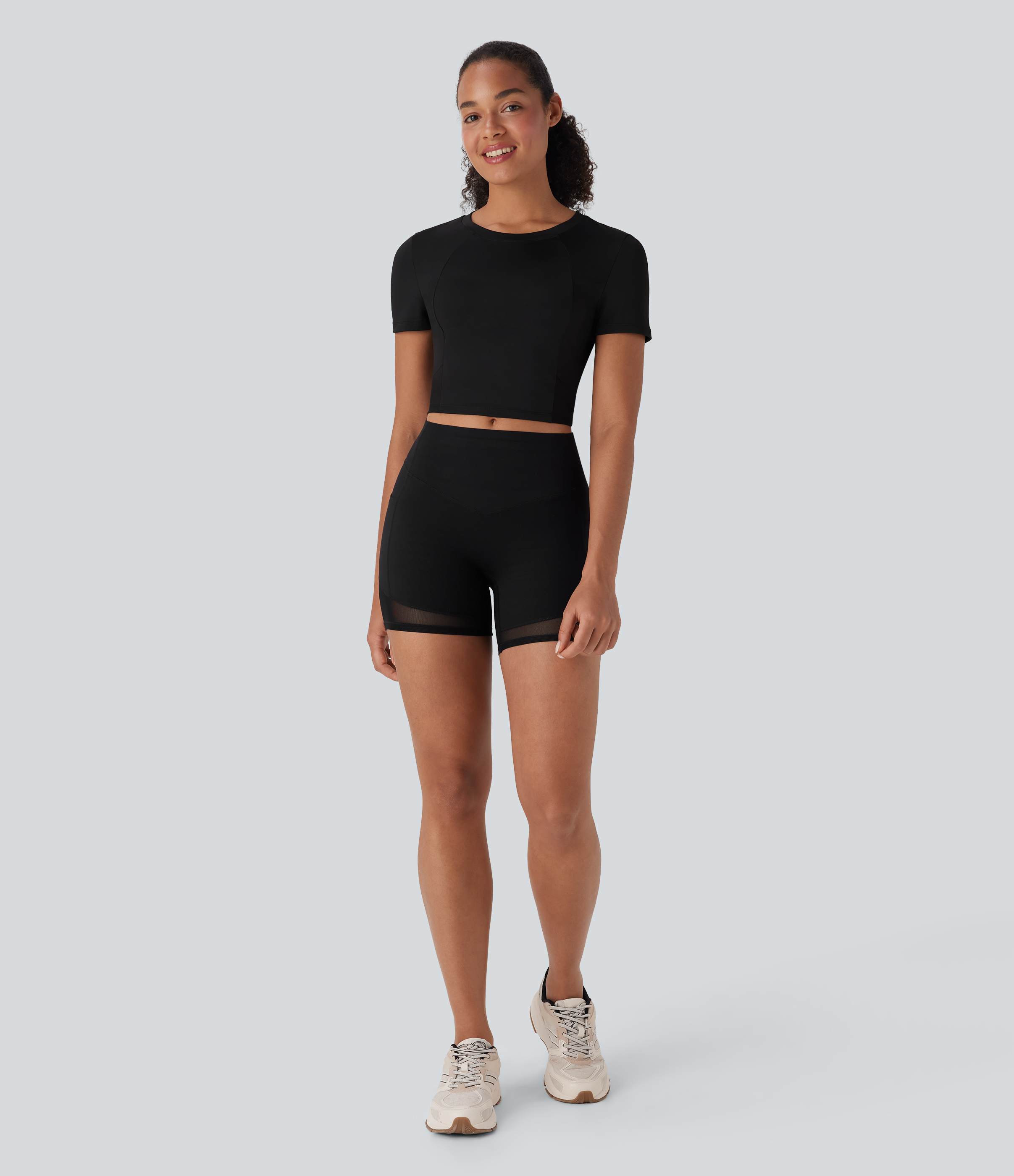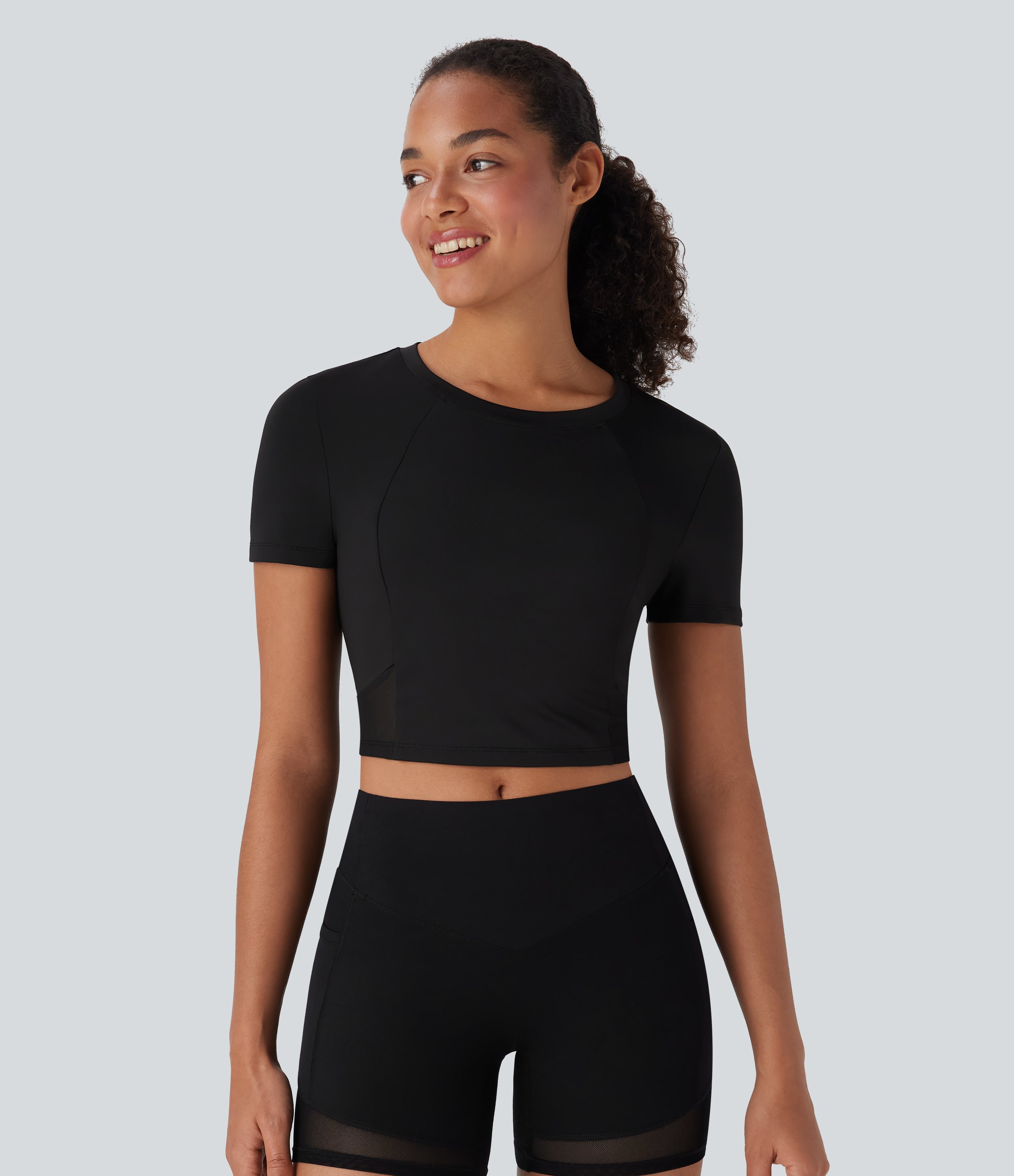 Round Neck Short Sleeve Contrast Mesh Cropped Yoga Sports Top