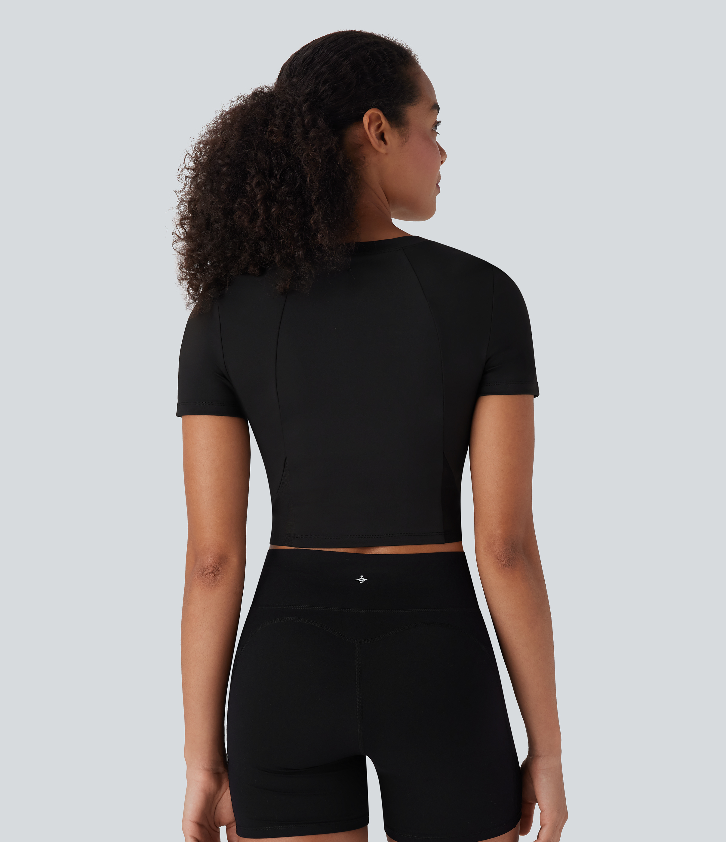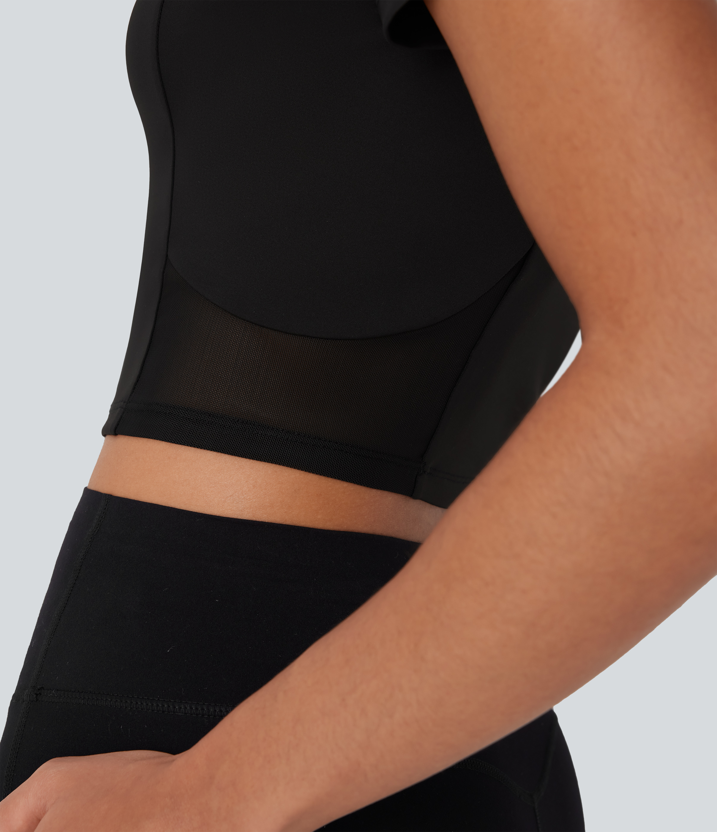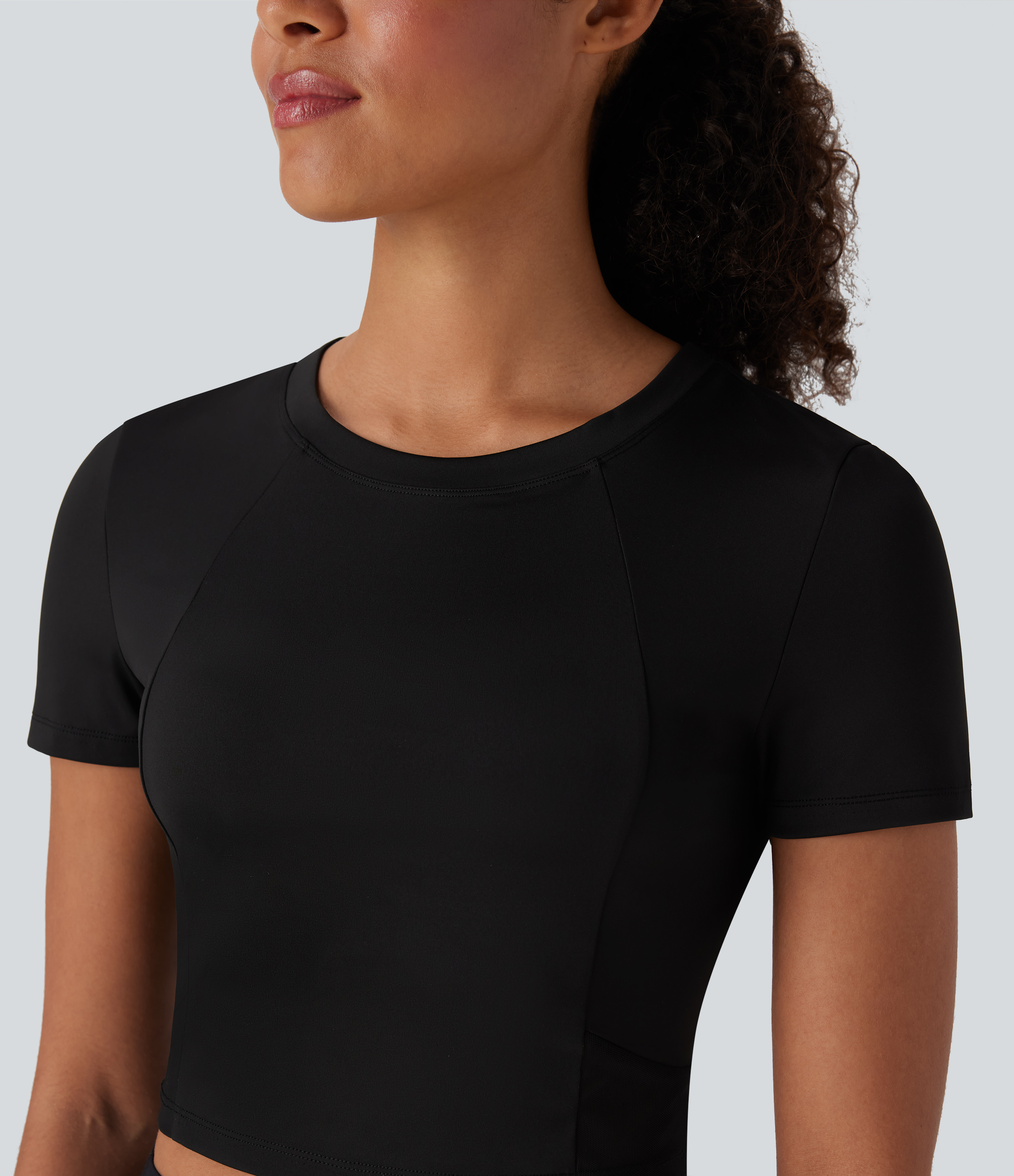 Round Neck Short Sleeve Contrast Mesh Cropped Yoga Sports Top