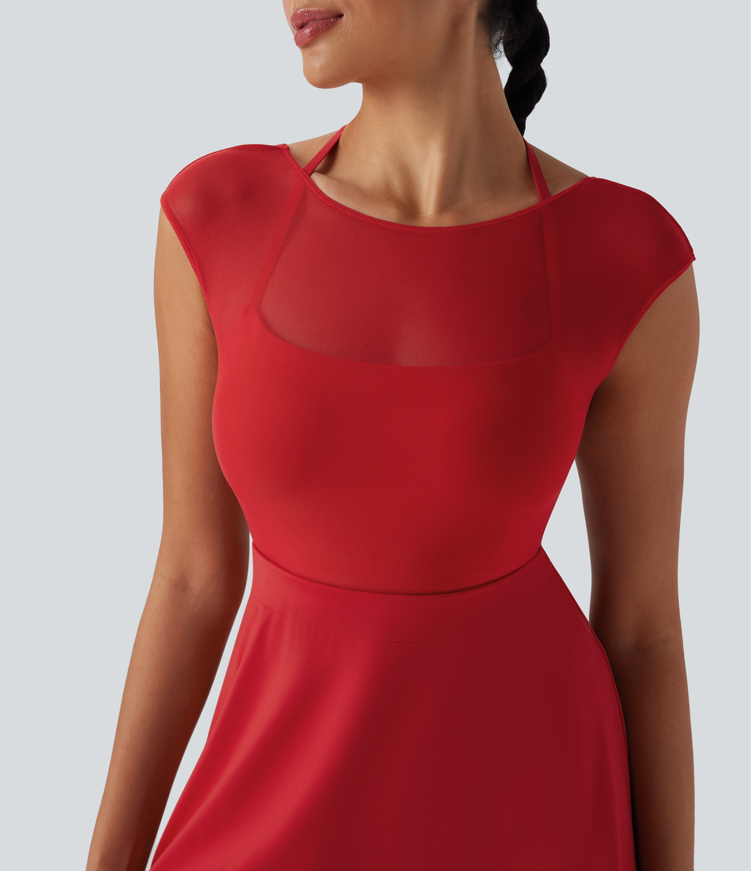 - Designed with a halter-neck style.