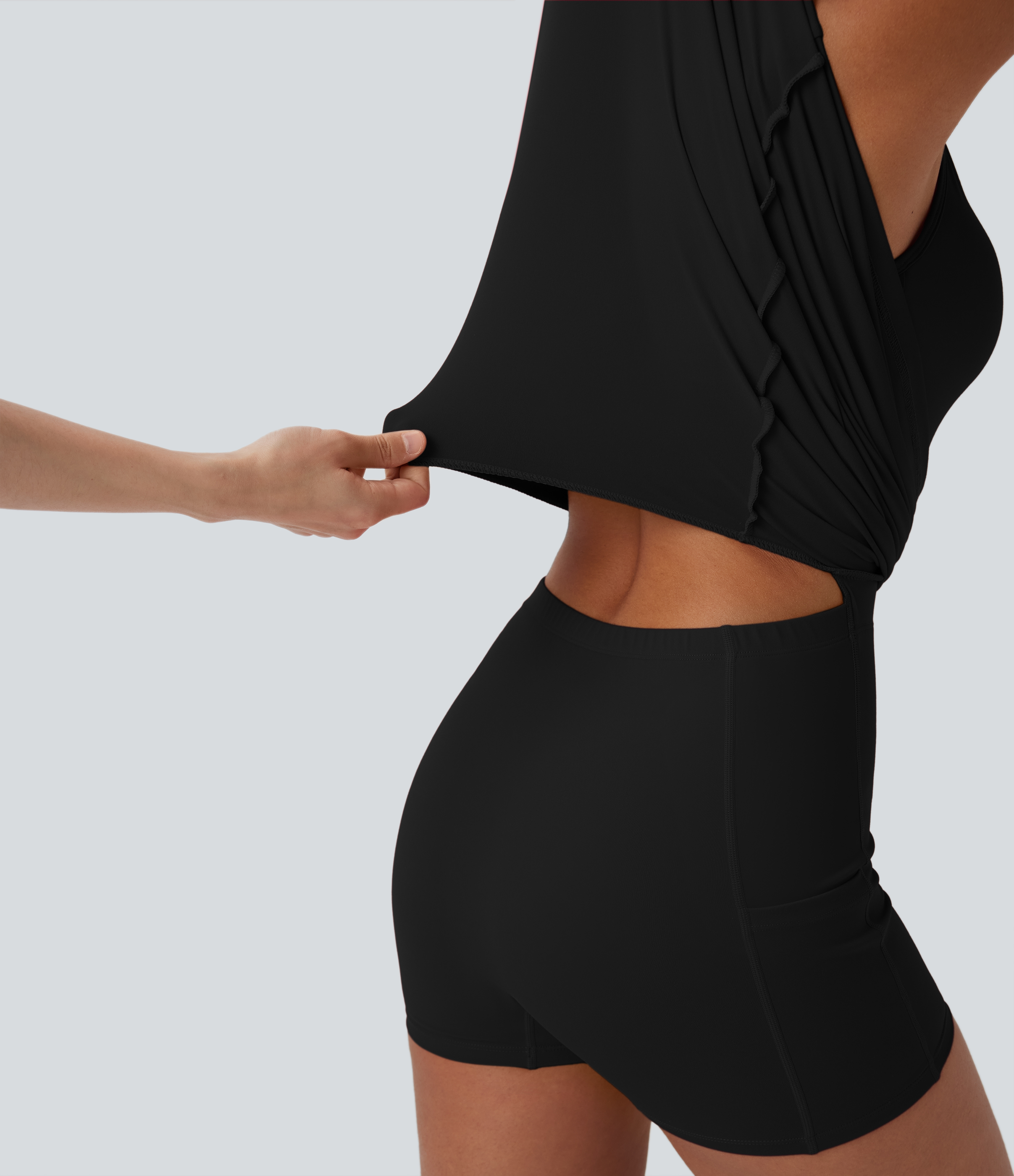 • Built-in shorts with open back waistband for easy peezy bathroom breaks.
