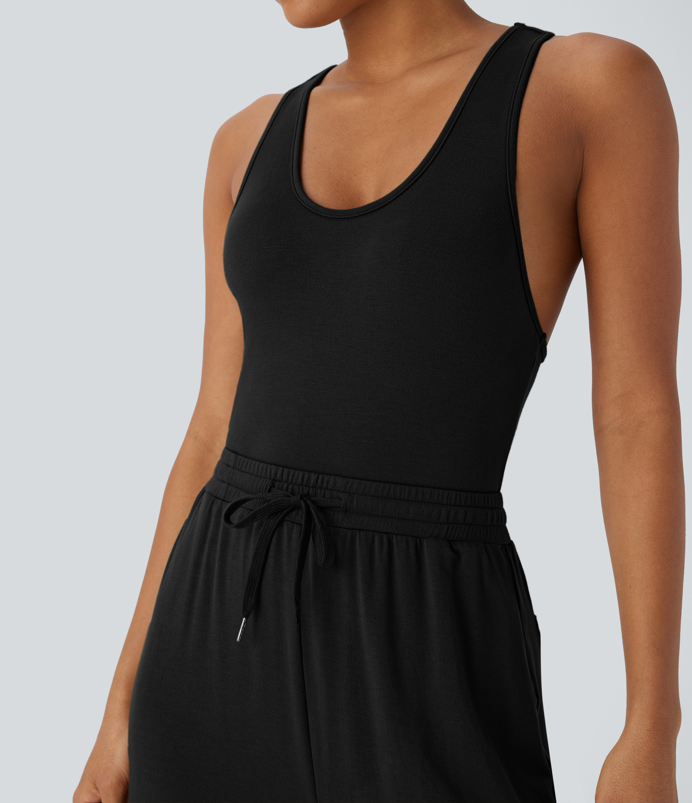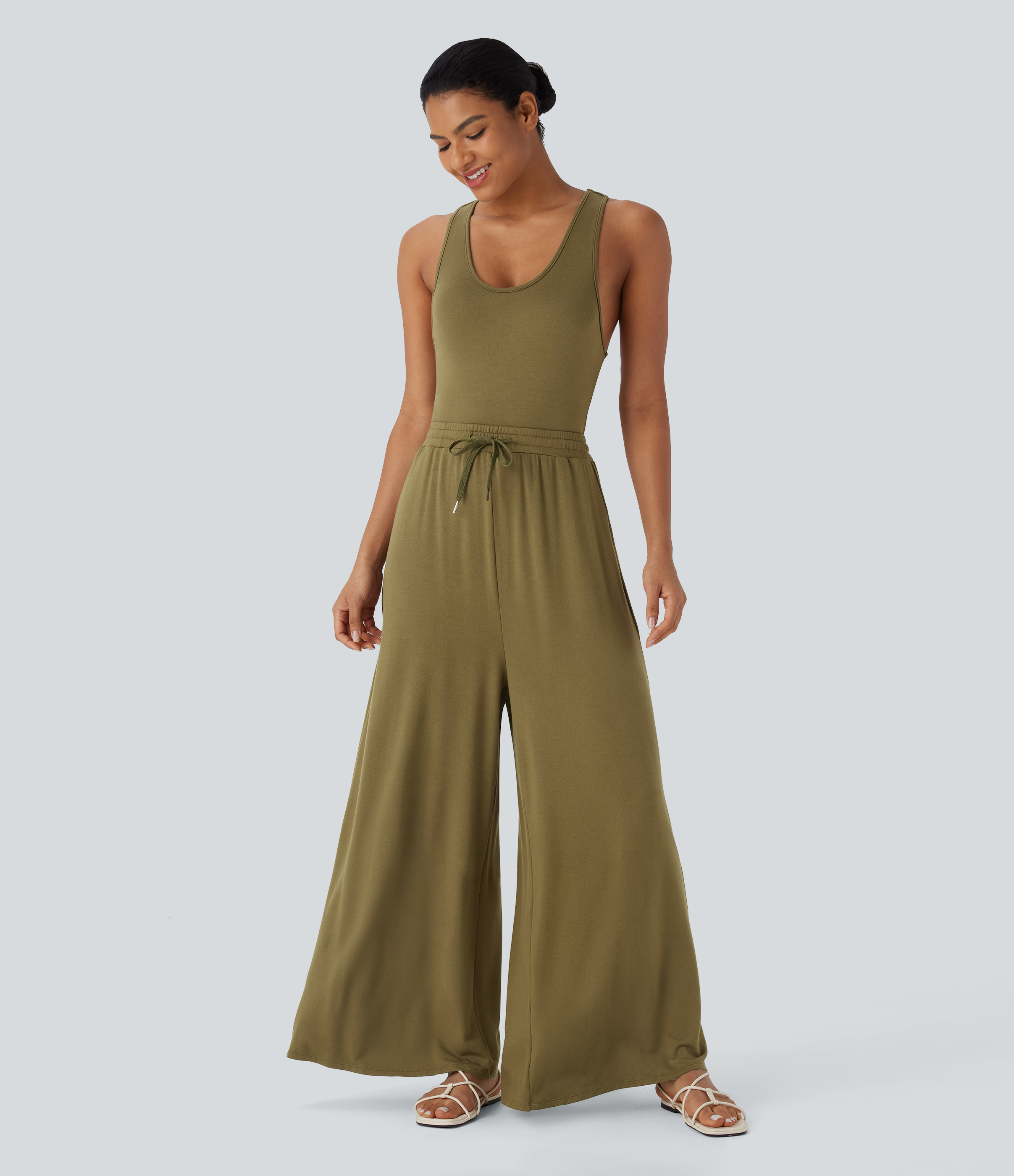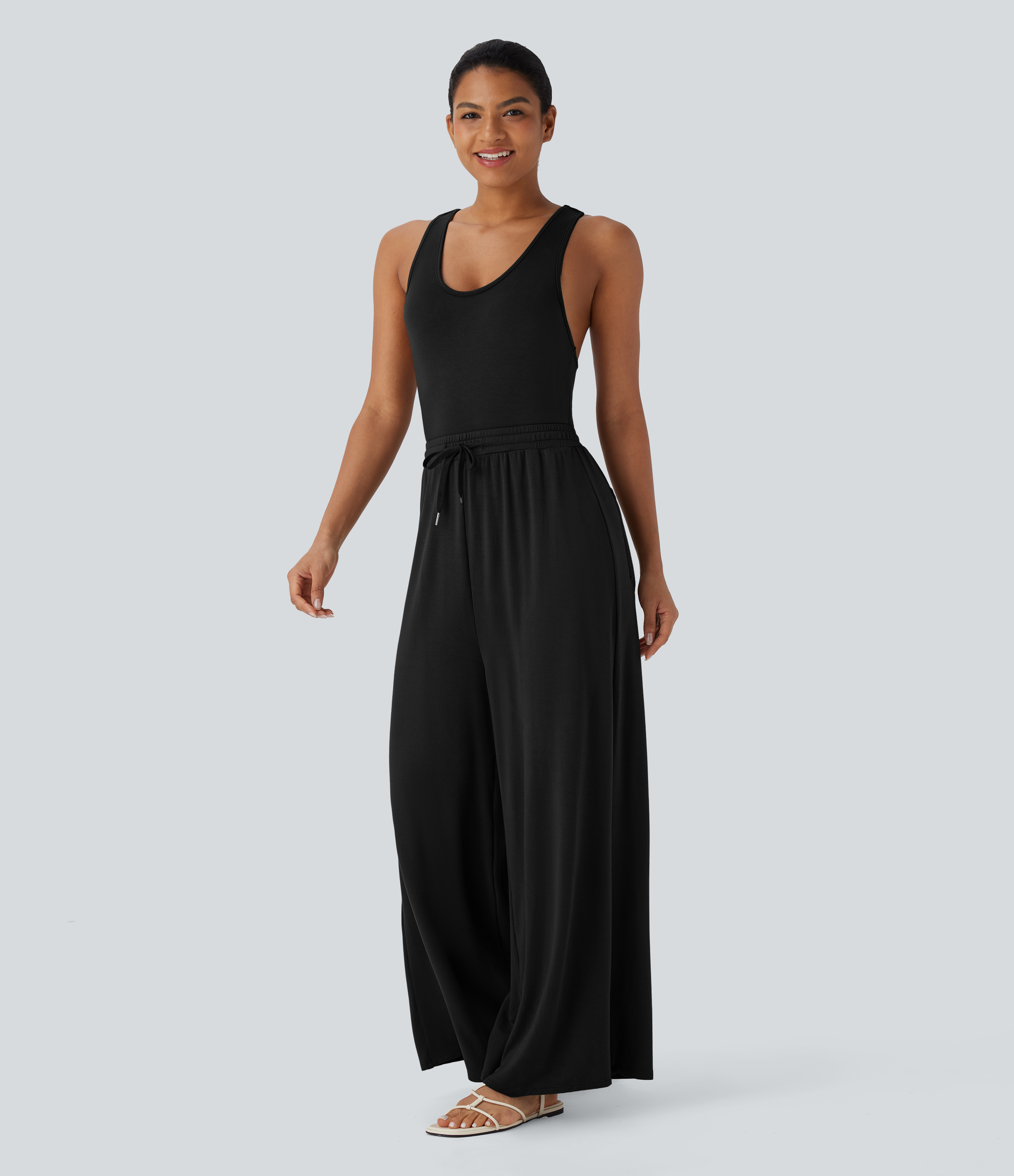 U Neck Racerback Drawstring Casual Jumpsuit with Pockets