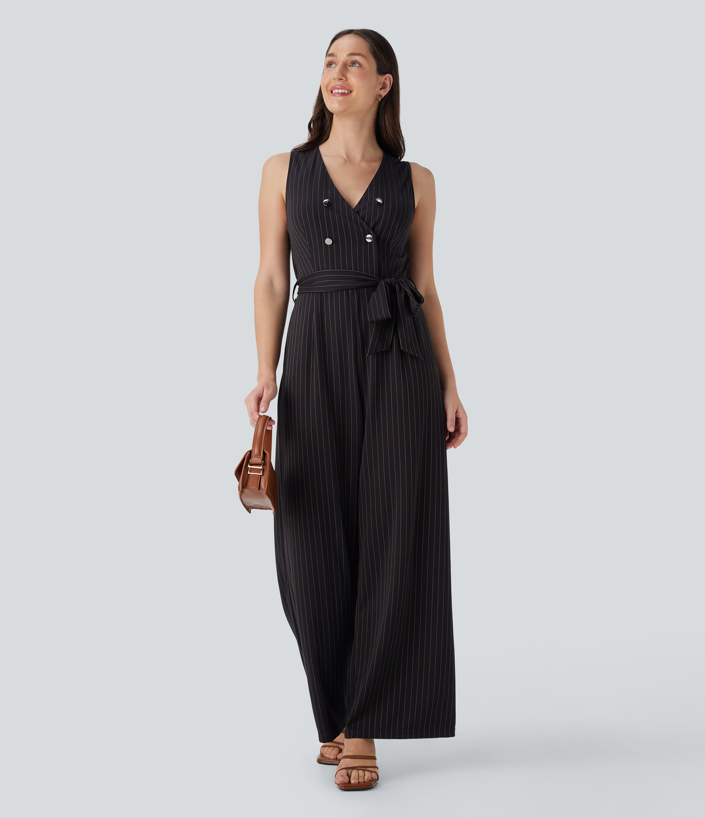 V Neck Sleeveless Belted Stripe Cool Touch Work Jumpsuit with Pockets-Easy Peezy