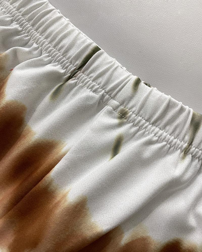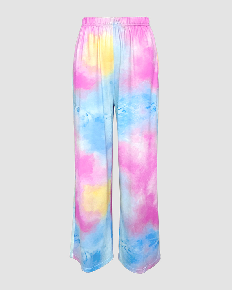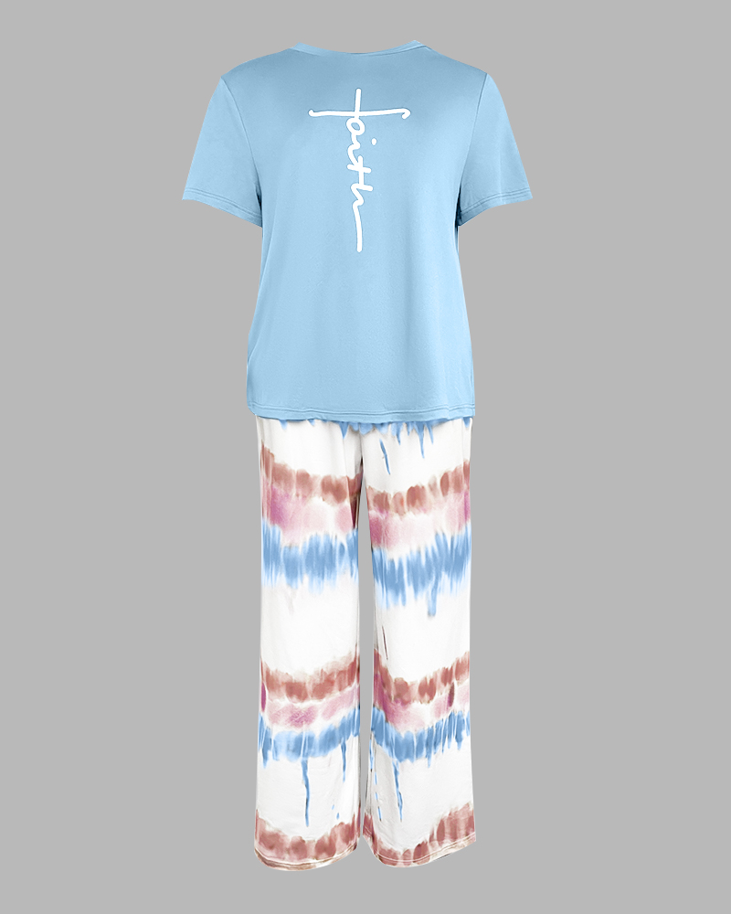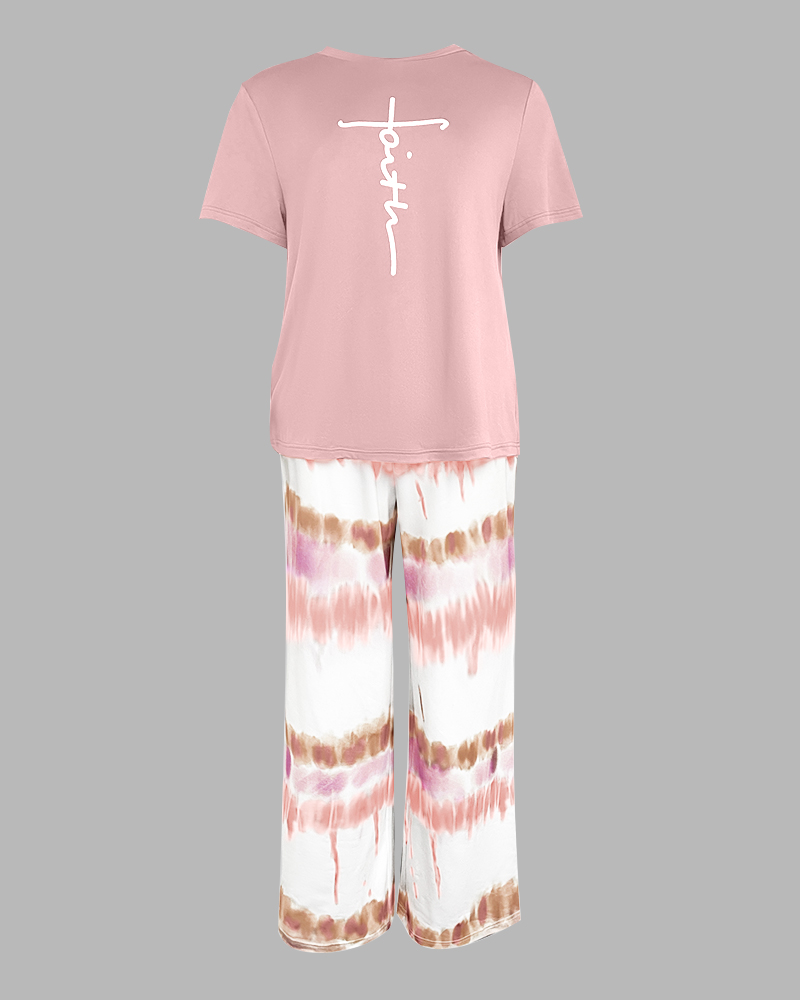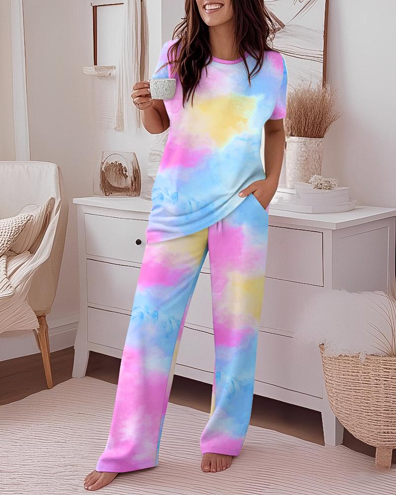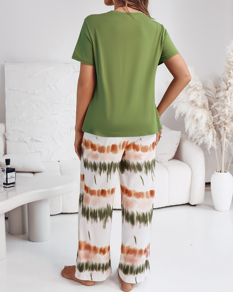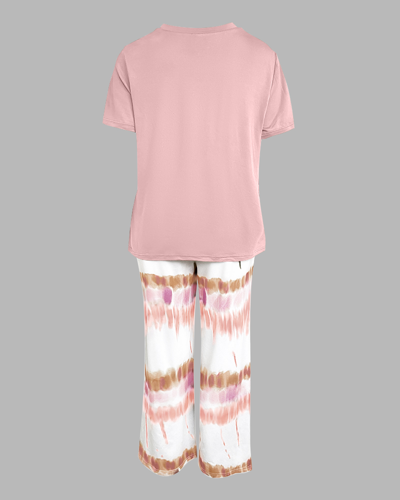 - Design Details – Letter print tee pairs with tie-dye print elastic waist pants featuring practical side pockets for added convenience at home.