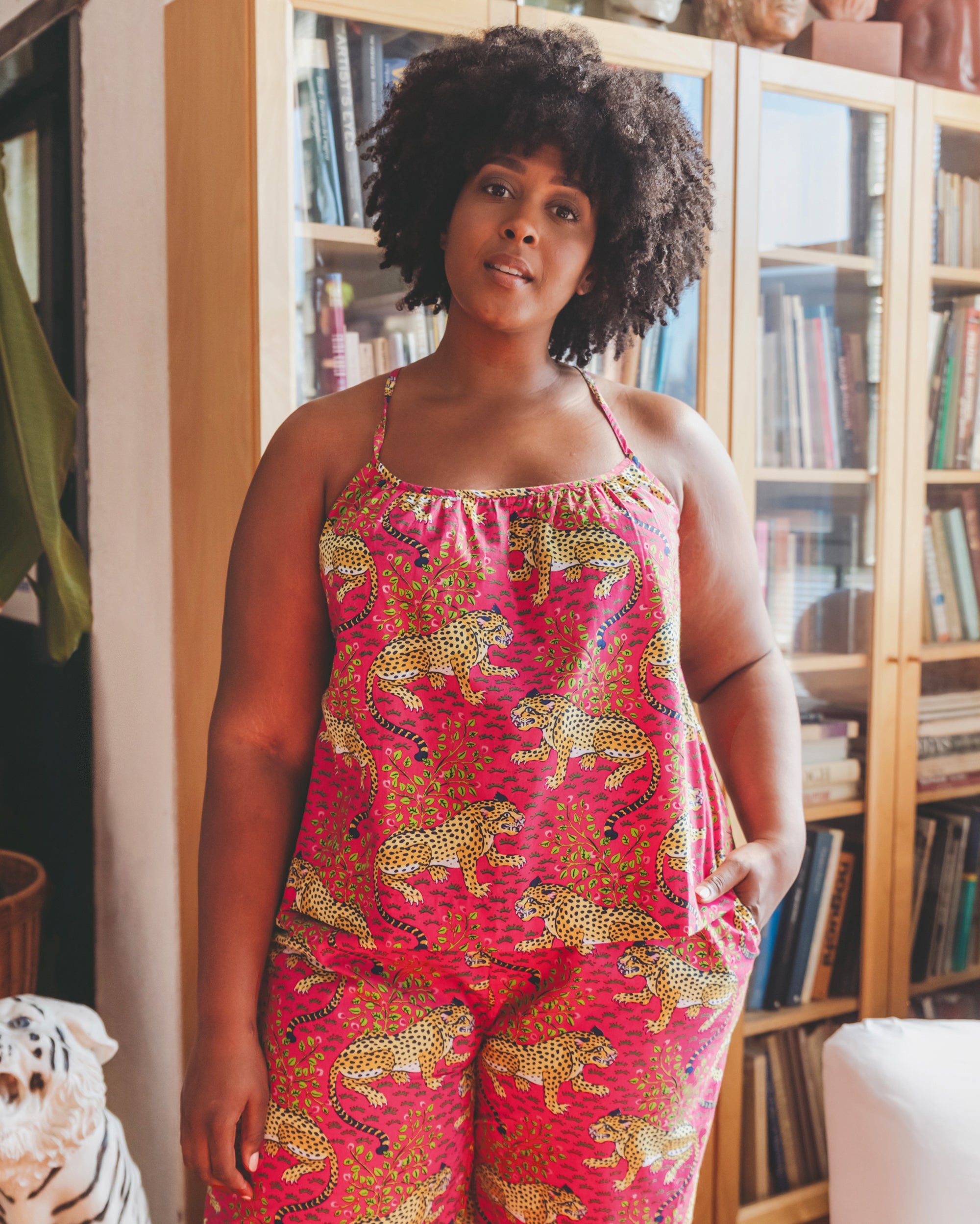 Carefully crafted from lightweight and breathable hand printed organic cotton, the Bagheera leopard printed sleep cami is the ideal boxy cut for a cozy and serene night’s sleep. The capri length cropped pants are the perfect choice when you’re trying to find leopard sleep pants for women or men–they’re so cozy that you might have to stop your loved ones from “borrowing” them every night!