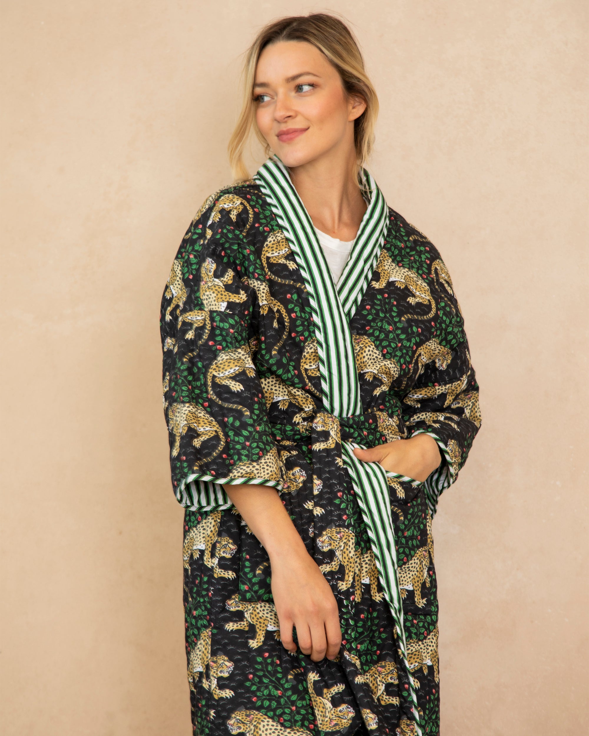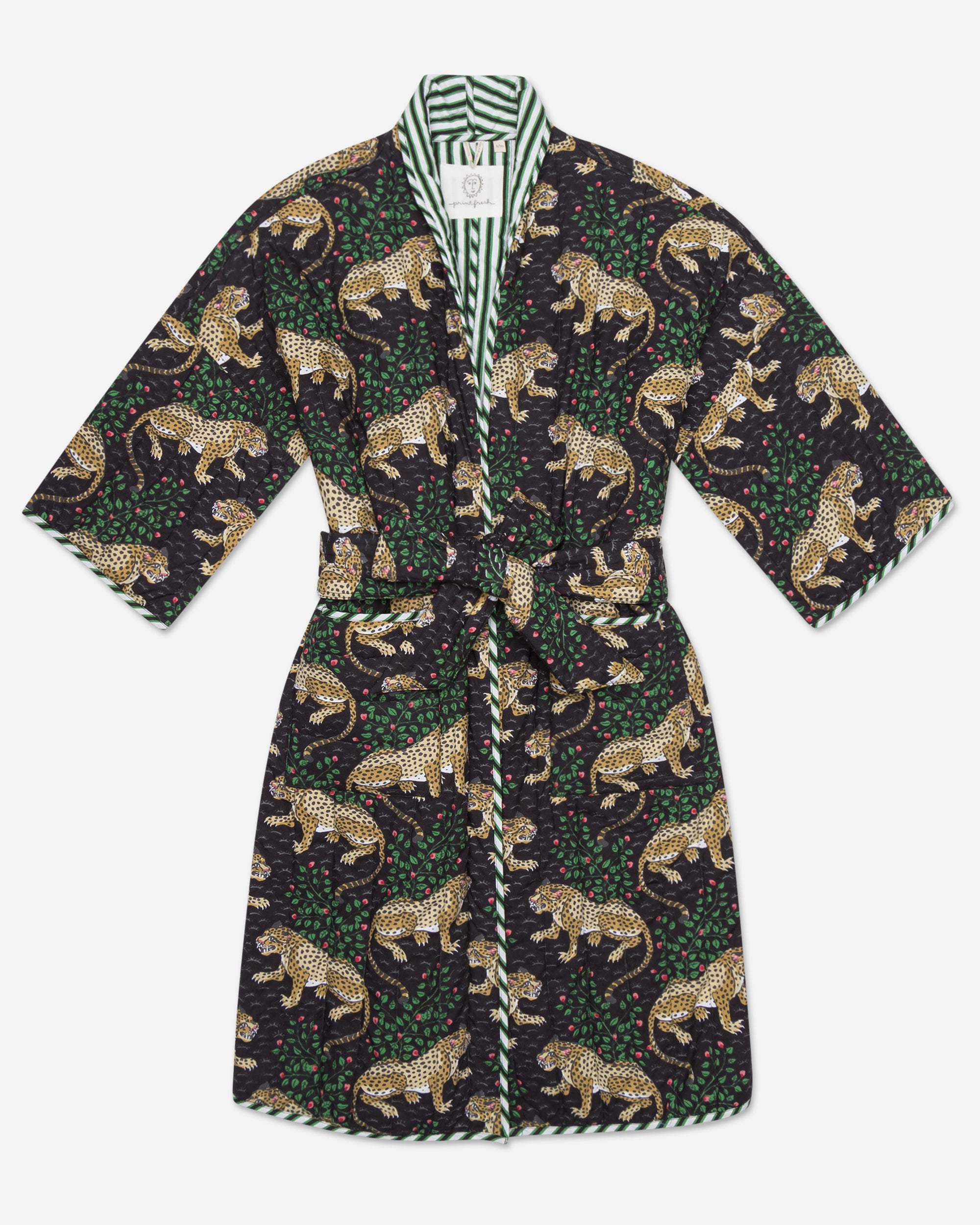 Good to know:The Pattern: We sprinkled a little magic on our iconic Bagheera print, giving her a fresh jet black paint job that’s long been requested. Beloved yet fierce, it’s like she’s stalking through the jungle for a midnight snack. This is a pattern for big cat enthusiasts who enjoy the moody vibe of post-sunset lounging. Pairs Well With: Slow mornings that blend into afternoons that lead into chilly nightfalls, because when wearing Bagheera Ink it’s perfectly acceptable to relax in stylish sleepwear all day long.