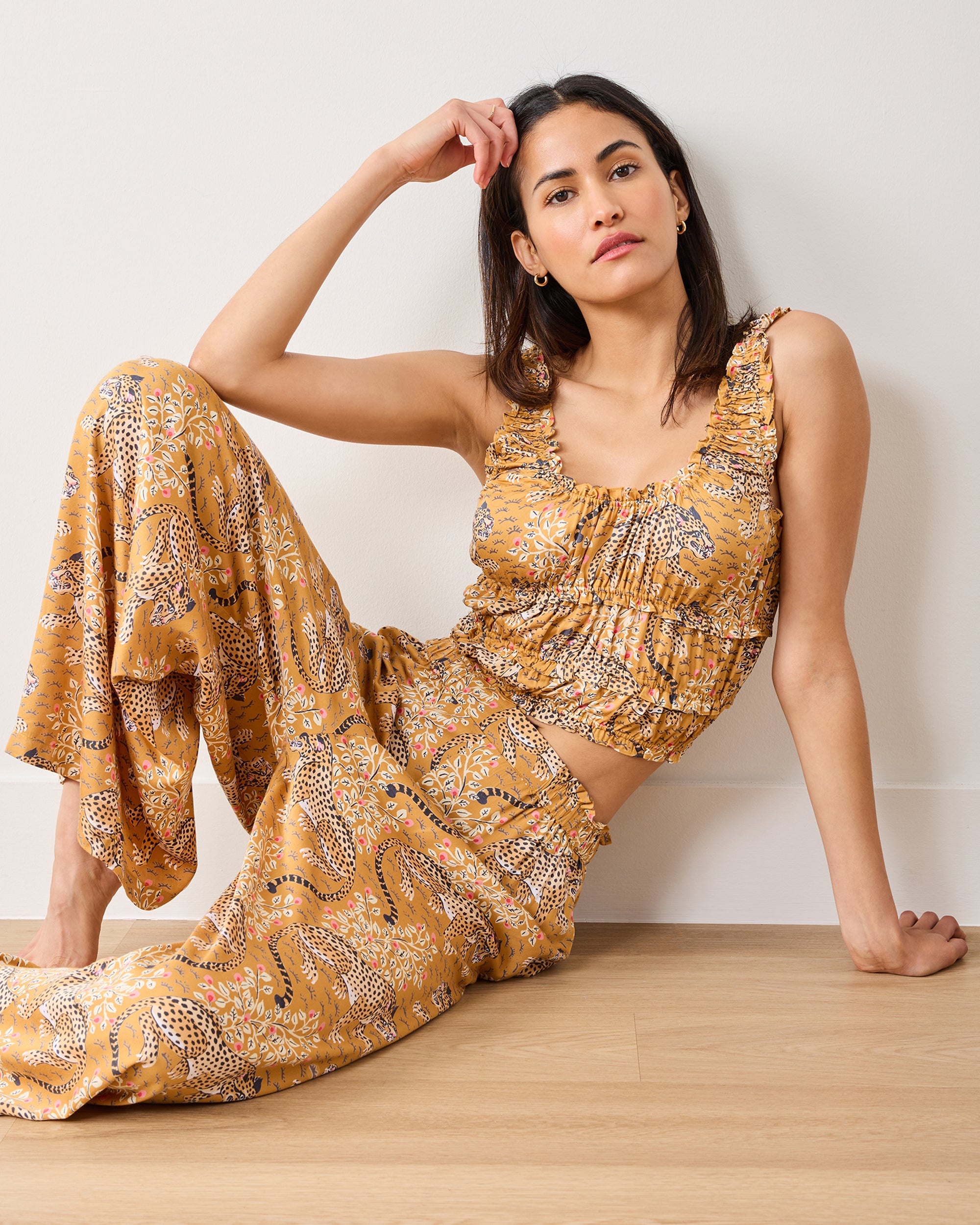 Make it an iconic season with our leopard print pajama set in rich tobacco. Featuring our signature Bagheera jungle cat, this women’s satin pajama set is crafted from breathable Eco Satin with a relaxed fit and ruffle-trimmed tank. A stylish jungle cat print pj set for day-to-night lounging. Explore more , , and .
