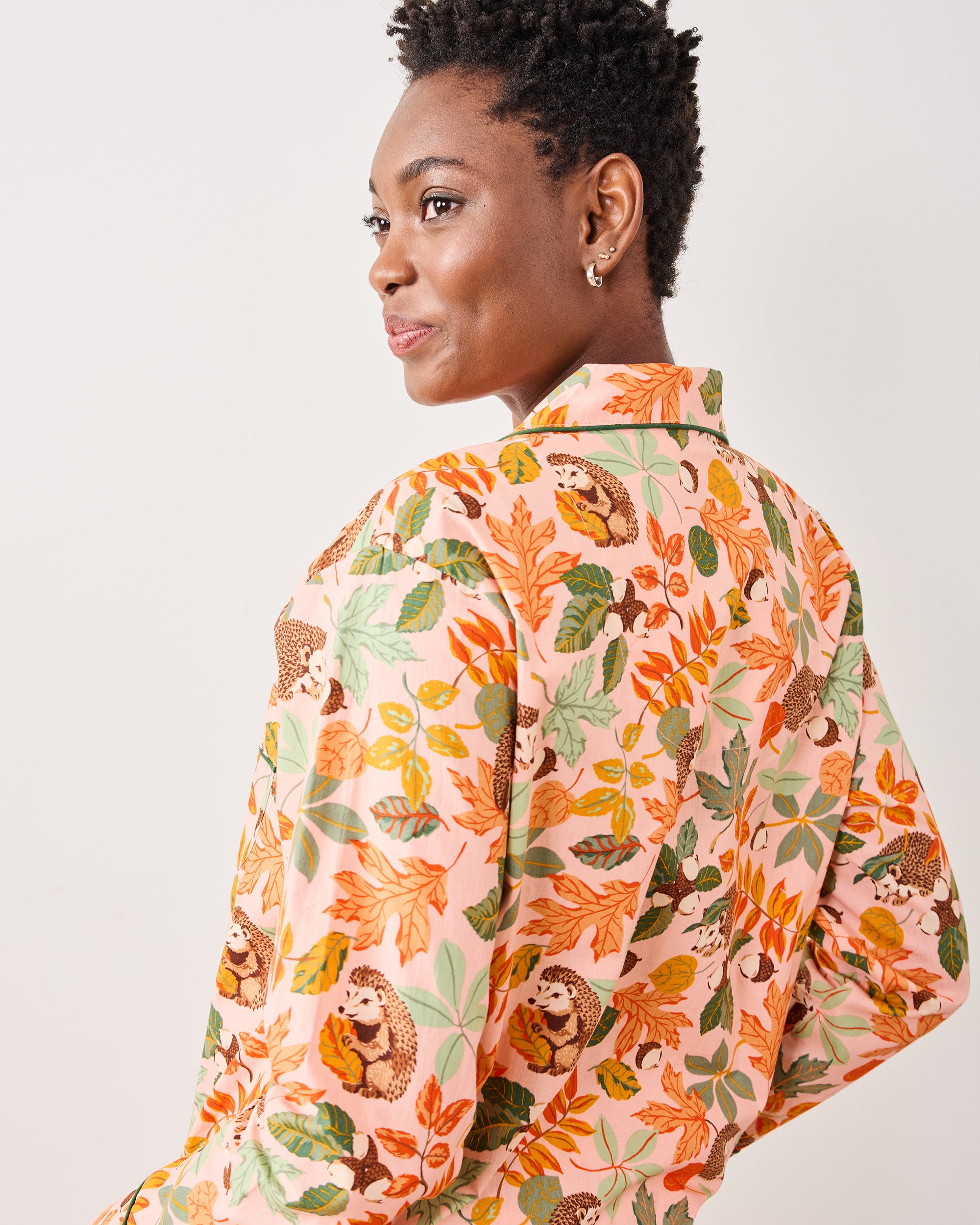 <p>Embrace woodland whimsy with our Hedgehog Forest pajama set in a Peach Leaf hue. This cotton fall sleepwear features charming hand-drawn hedgehogs nestled among autumn leaves, printed on breathable organic cotton. With a button-down top, pants with pockets, and a chic silhouette, it's perfect for cozy fall evenings and peaceful mornings in the countryside. Explore more <span style="text-decoration: underline;"><a href="https://printfresh.com/collections/pajama-sets">pajama sets</a></span> and <span style="text-decoration: underline;"><a href="https://printfresh.com/collections/long-sleep-sets">long sleep sets</a></span>.</p> <ul>