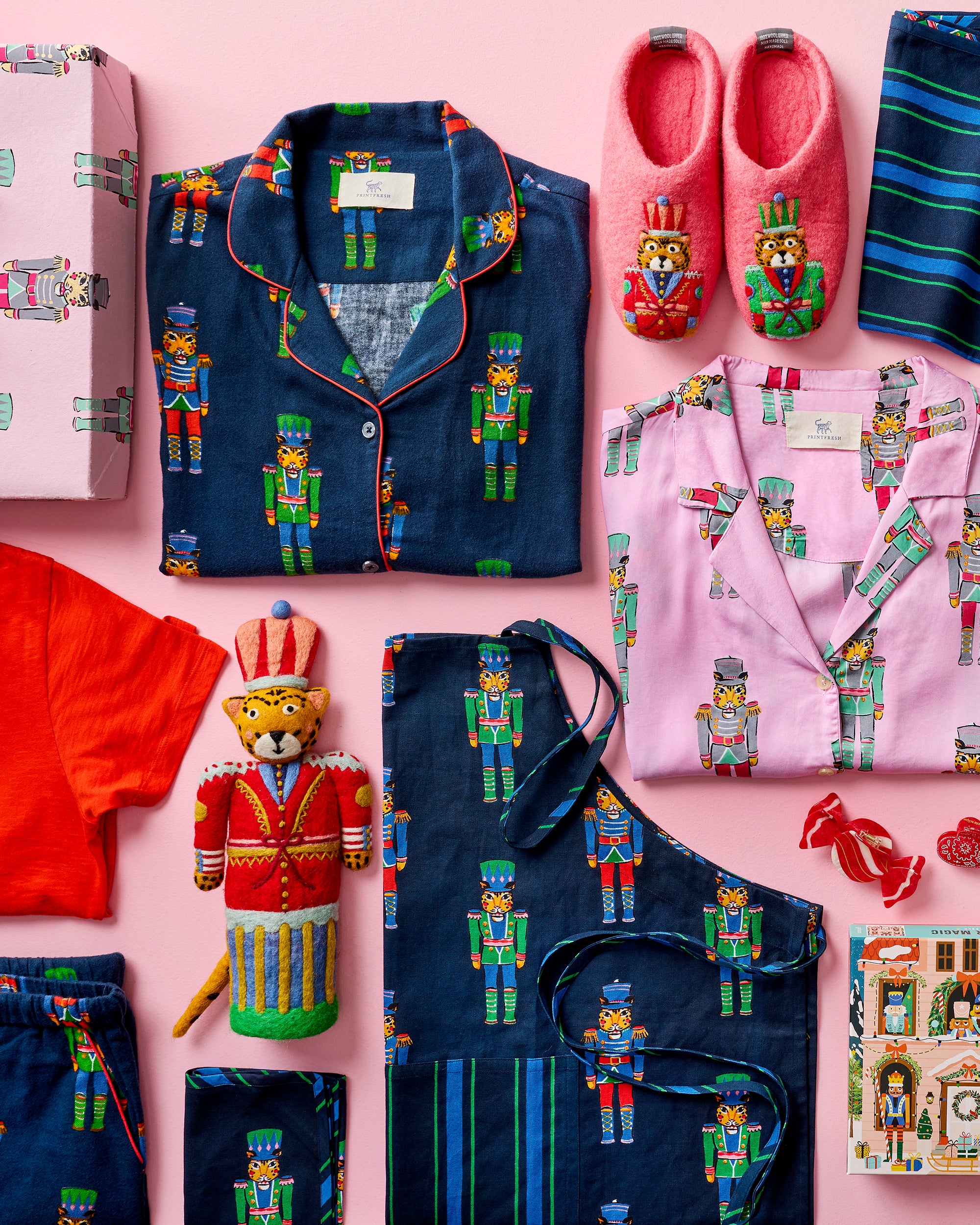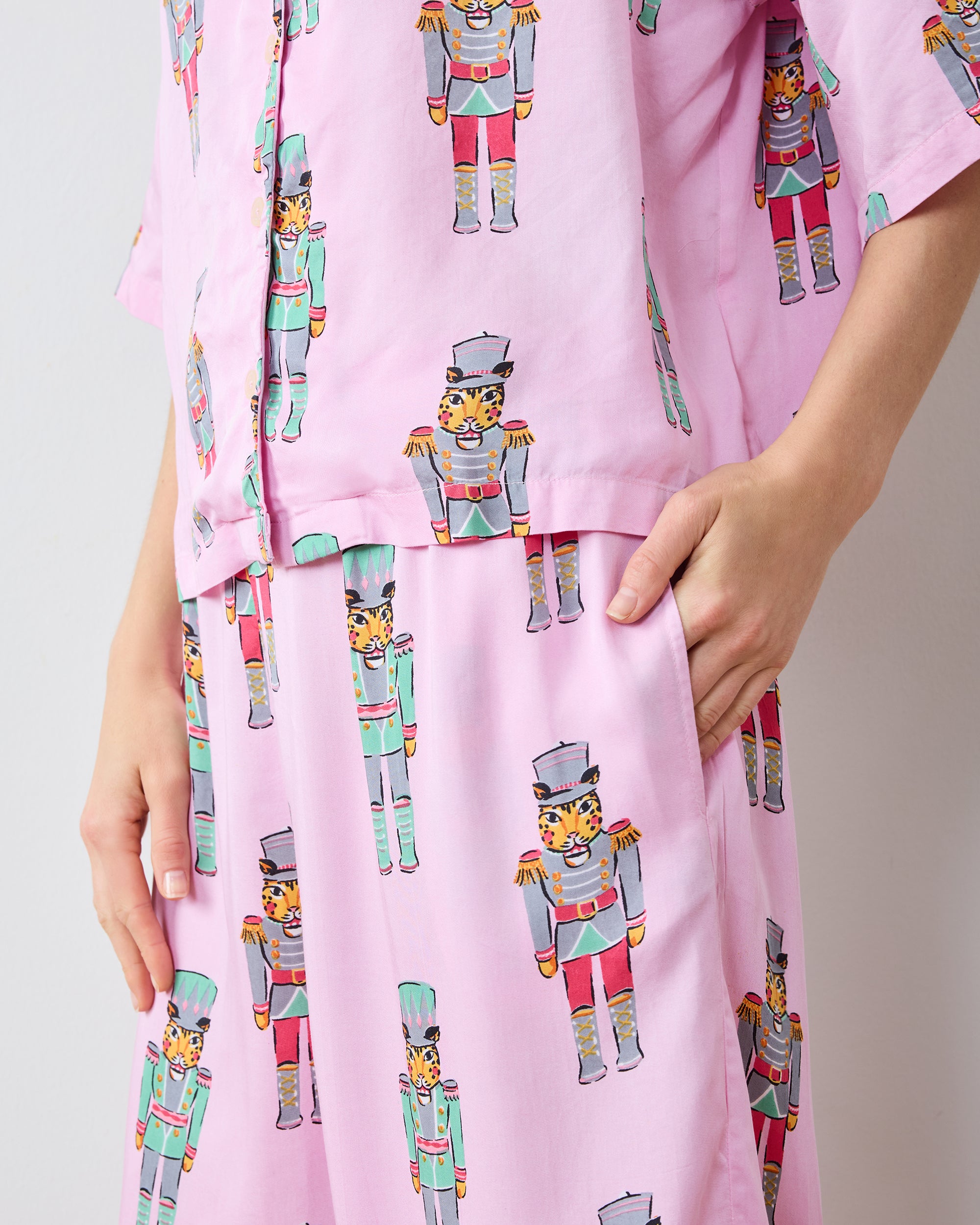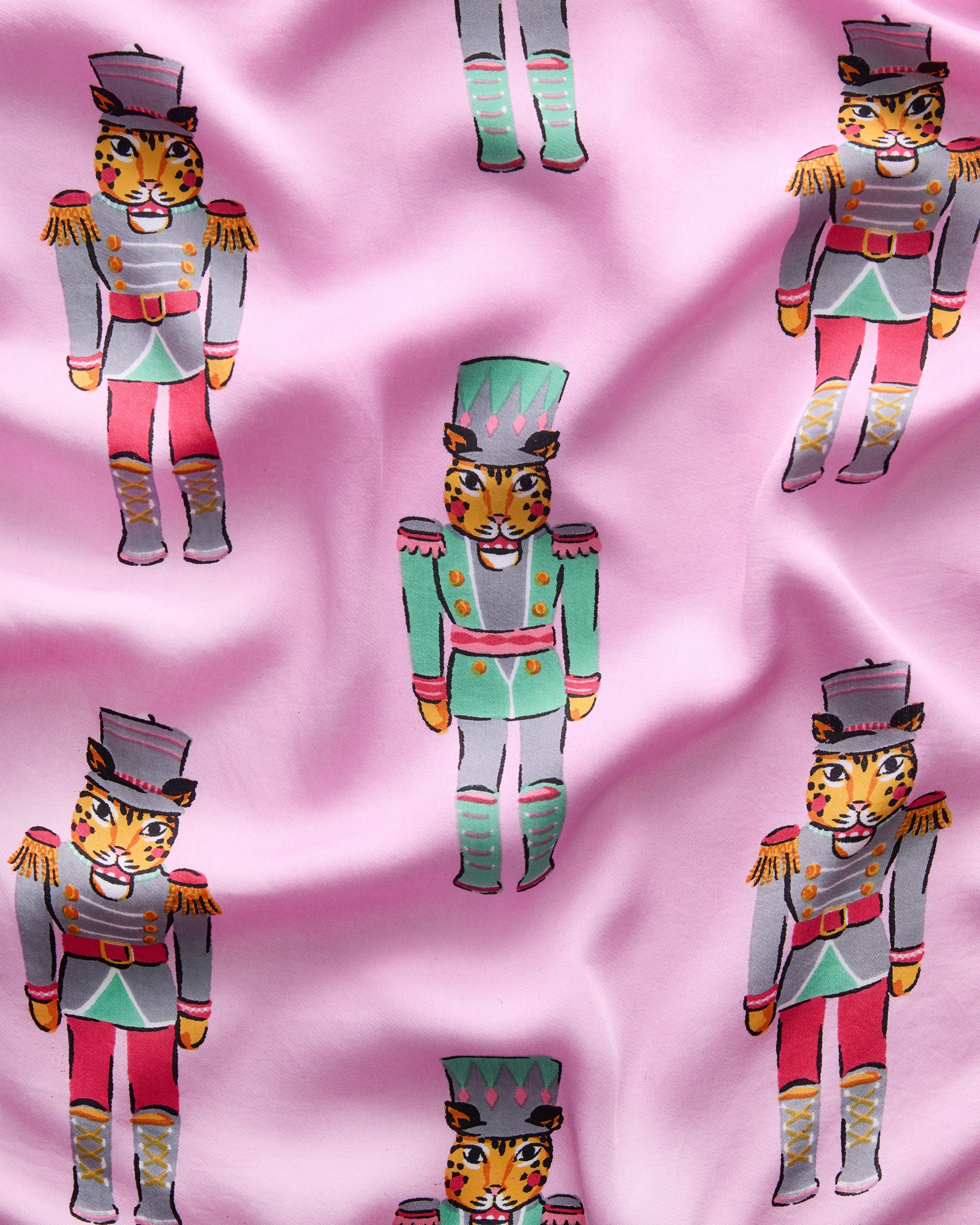 Holiday magic meets wild sophistication in our Leopard Nutcrackers satin lounge set in Pink Candy Cane. This pink satin pajama set features majestic leopards with whimsical nutcrackers on luxurious Eco Satin. The slightly cropped top creates a relaxed silhouette, while the satin wide-leg pajama pants provide high-rise comfort with deep pockets. Luxe holiday satin sleepwear for festive lounging. Discover more , , and .