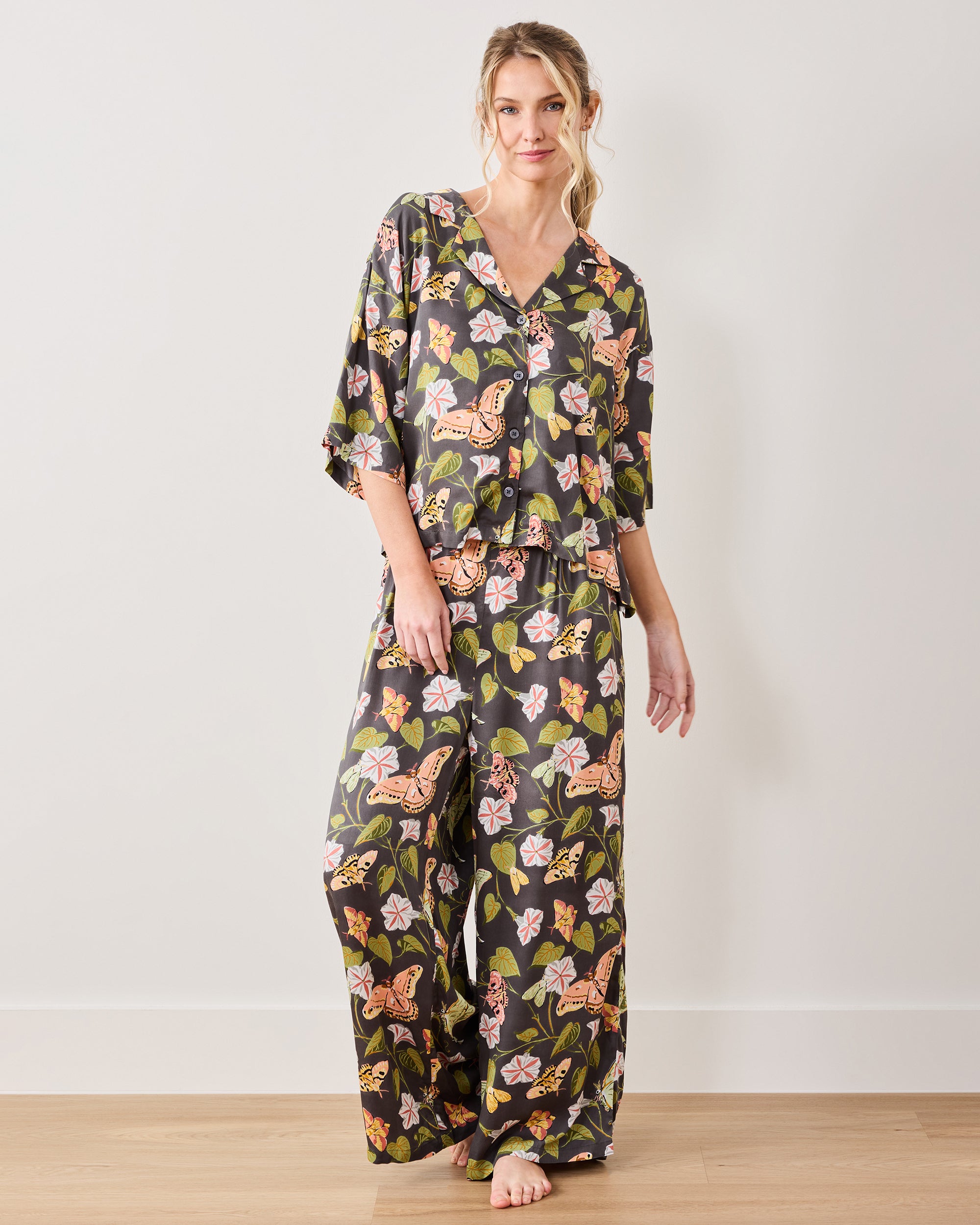 Moths dance through leafy greenery in our Eco Satin Wildest Dreams Midnight Flutter petite satin pajama set in Slate. The slightly cropped top features drop shoulders and high-rise, wide-leg pants with pockets, tailored for petite frames. This petite lounge set transforms bedtime into a nature-inspired dreamscape. Explore more , , and in magical hand-drawn prints.