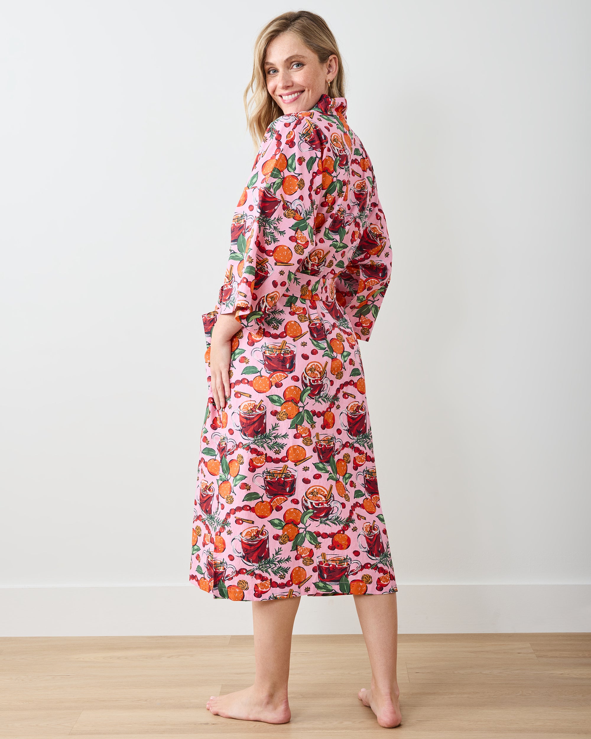 Steep yourself in holiday magic with our Mulled Wine cotton robe in Pink Tinsel. Glass mugs, cranberries, and spices dance across breathable organic cotton in this festive hand-drawn print. Our holiday robe features an elegant floor-grazing length, deep pockets, and a matching belt for a custom silhouette. Perfect cotton sleepwear layer for holiday breakfast prep. Explore our and for more seasonal delights.