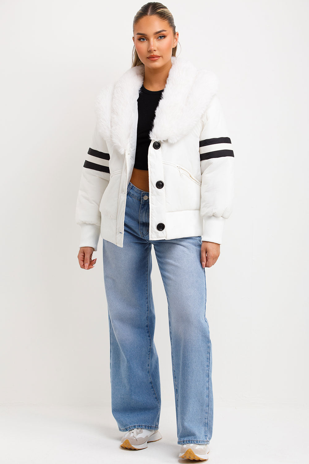Aviator Bomber Jacket With Faux Fur And Stripe Detail White