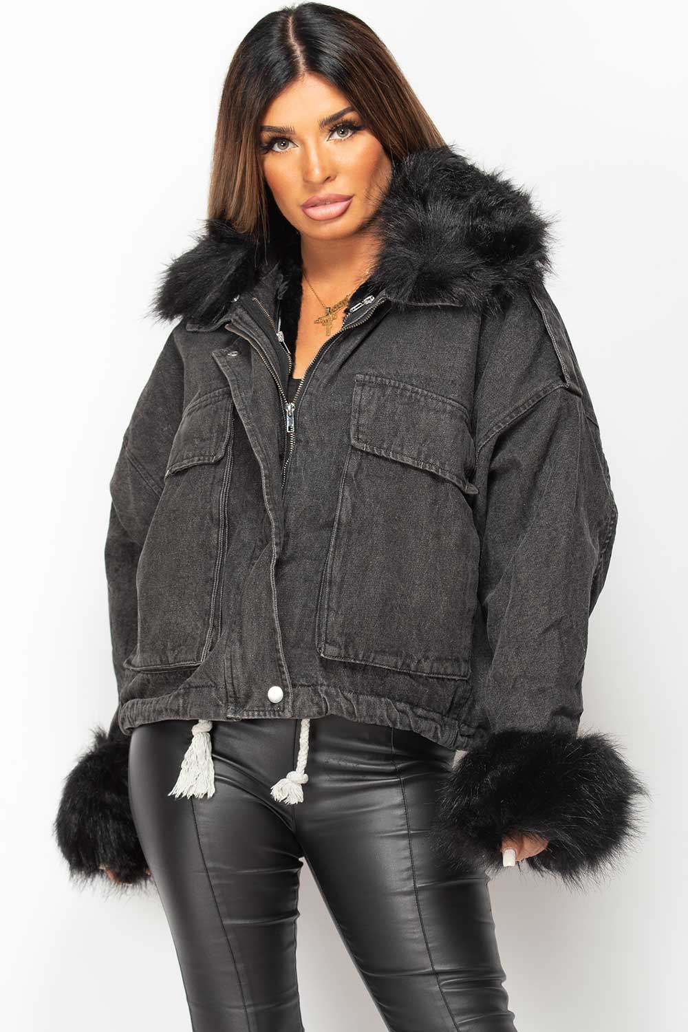 This oversized denim jacket with black faux fur collar will keep your style game bang on trend in this new season. Featuring denim fabric detachable soft fur lining and faux fur detachable collar and cuffs. Style it with our cute crop JUMPER and high waisted jeans to complete the look.