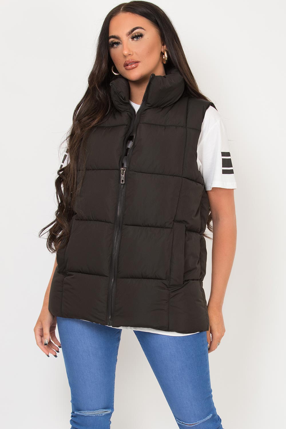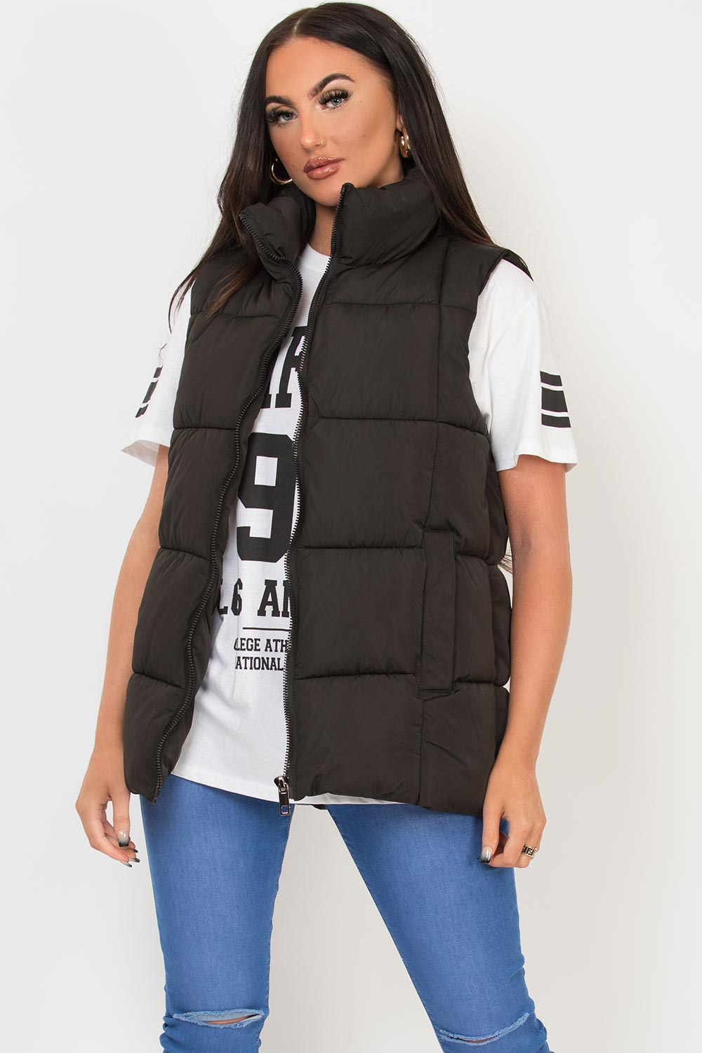 Black gilet body warmer. Puffer padded gilets are must have for this season and the next. This padded puffer gilet features quilted body warmer style sleeveless zip fastening pockets and weather resistant. Wear it with our oversized t shirt or hoodie to complete the cute casual practical look. Also available in other colours.