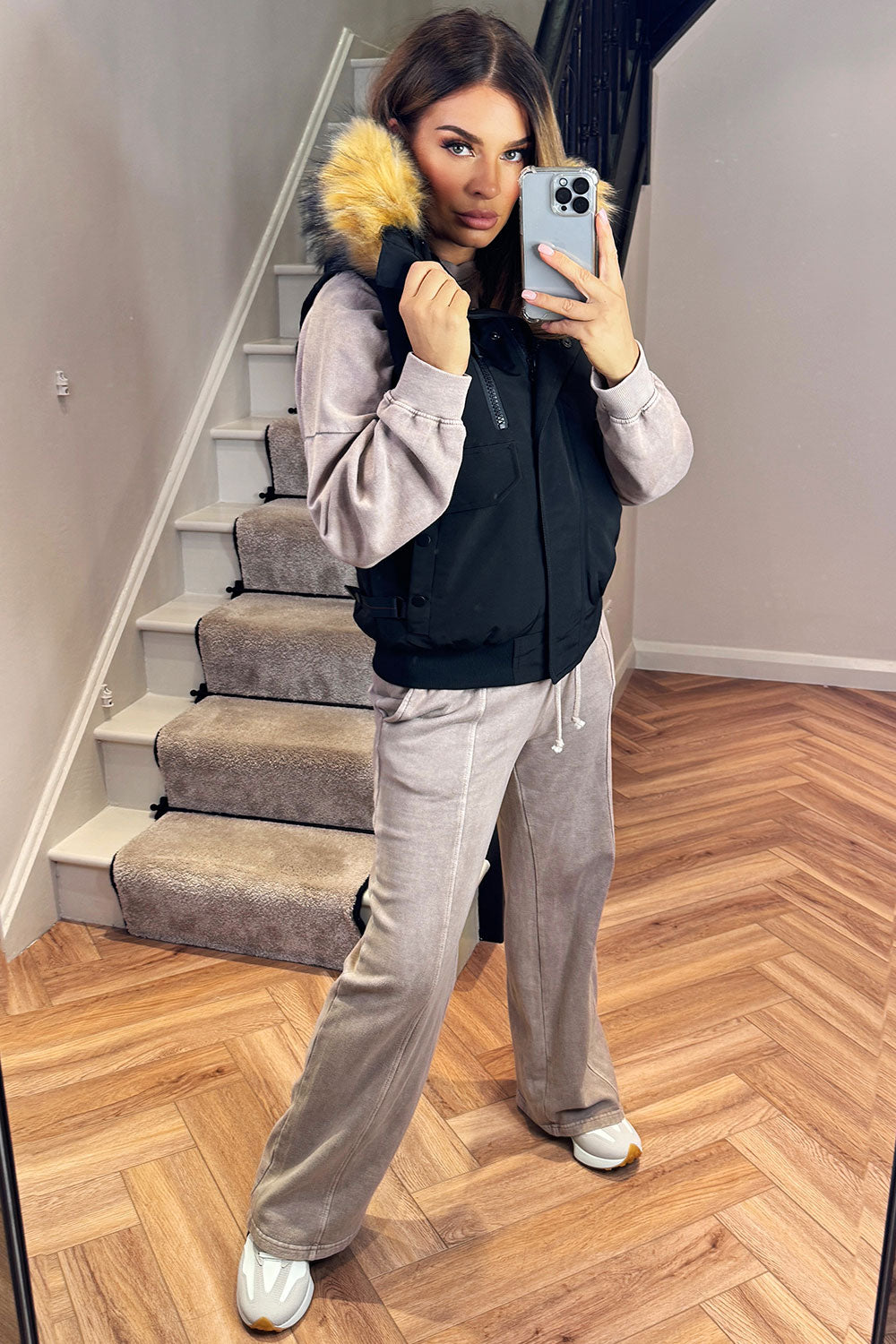 Gilet with faux fur hood. This faux fur hooded gilet is a must have outerwear piece for your new season wardrobe. Featuring short gilet extremely warm lining windproof weather resistant with big faux fur hood, detachable faux fur trim, pockets and zip fastening. Style this short hooded gilet with our gym sets or loungewear to complete your everyday outerwear outfit.
