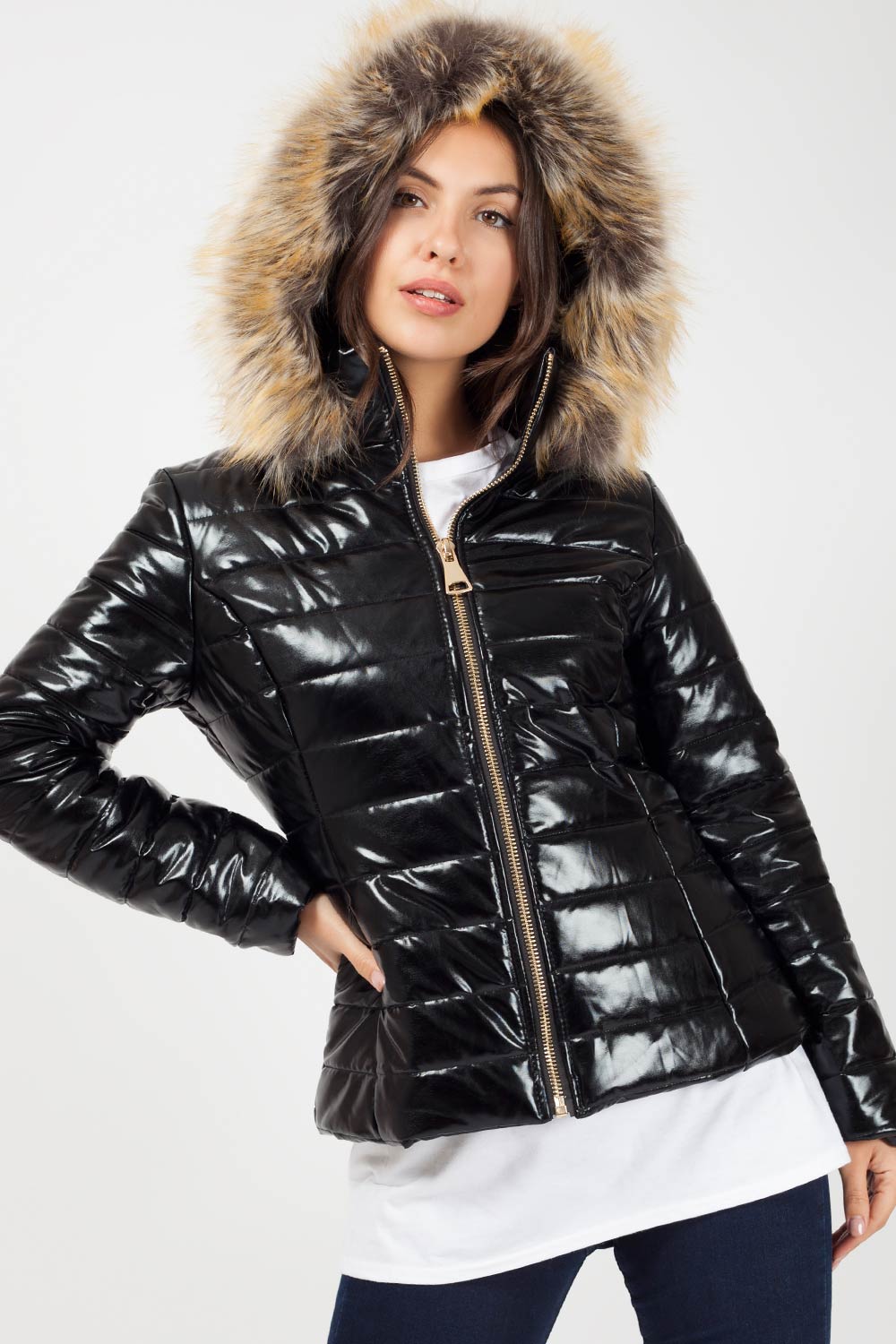 Stay warm in this winter in this wet look padded jacket. Featuring on trend faux fur hood, shiny wet look material and slim fit. Padded material traps body heat and keeps you warm in the coldest days. Get it styledup with cute crop jumper and skinny jeans.