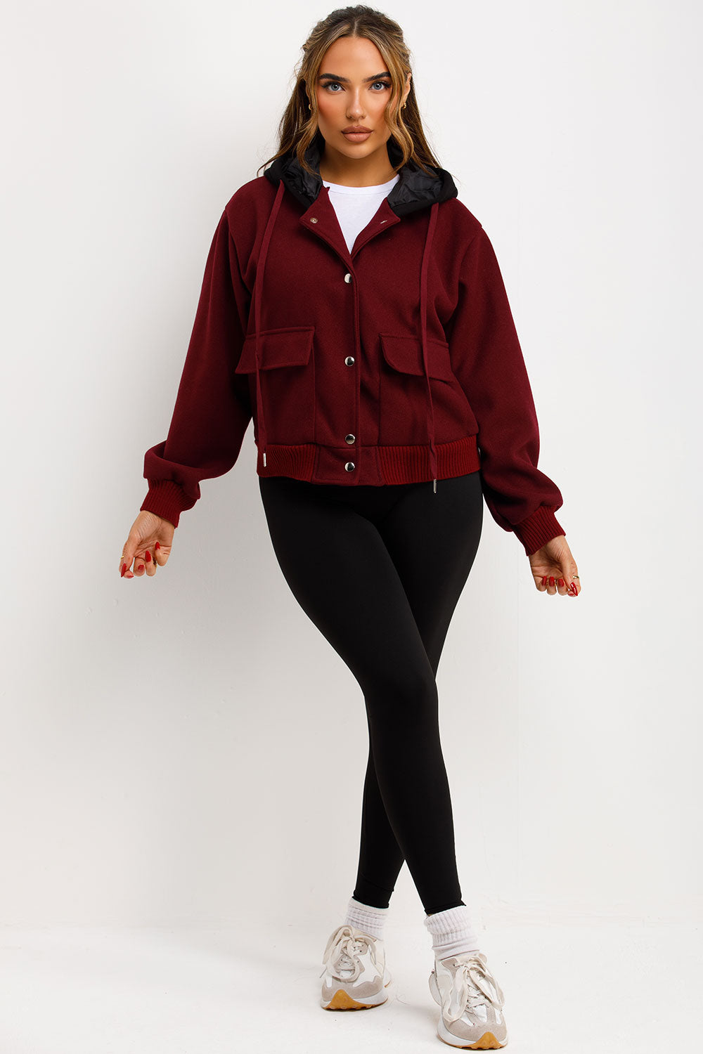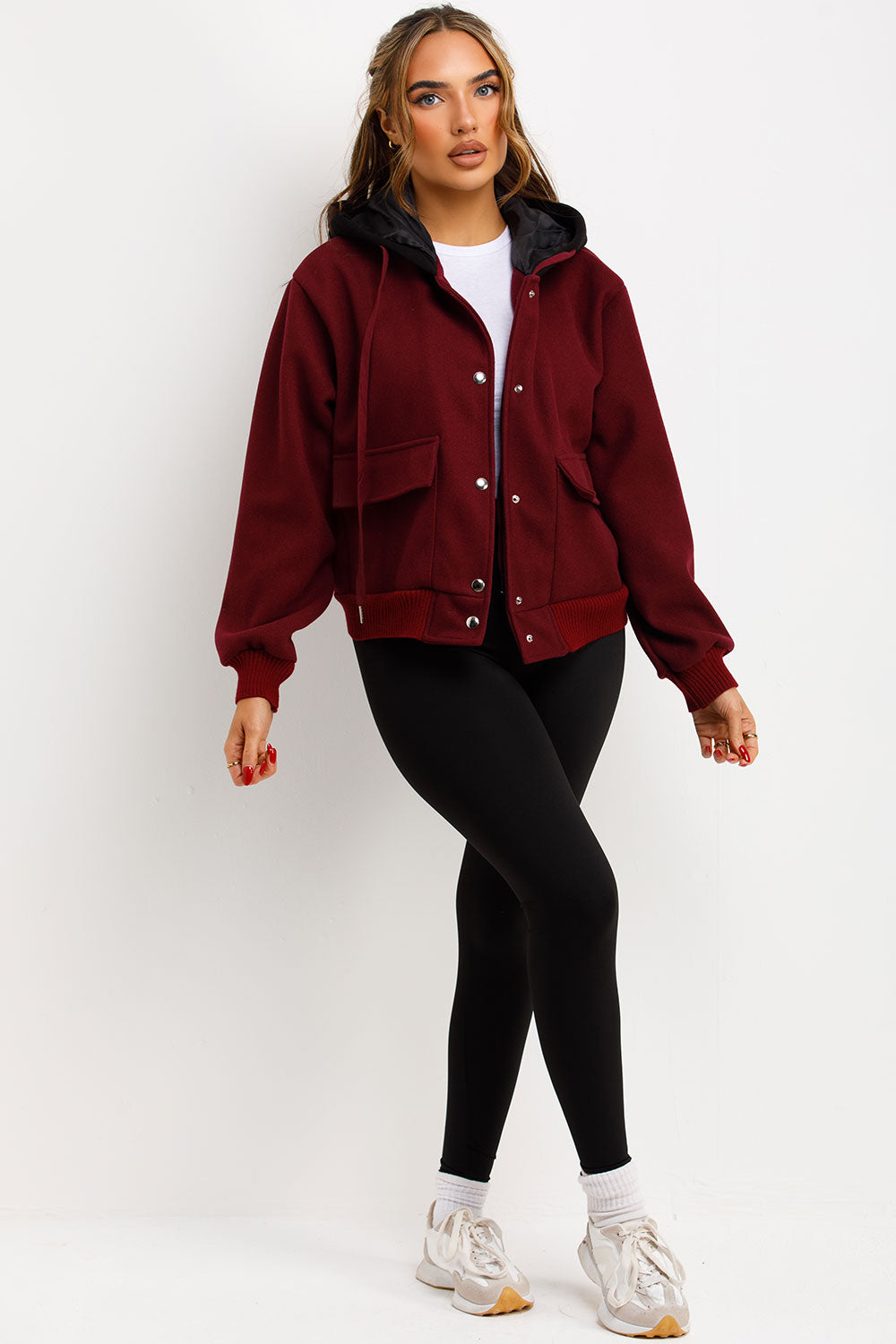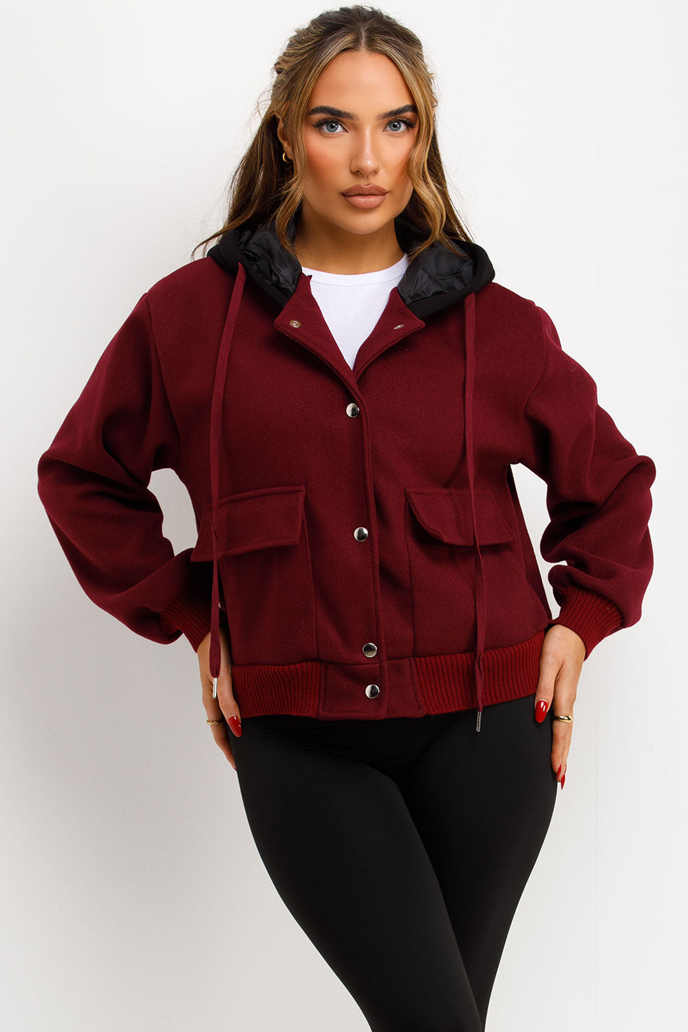 Bomber baseball jacket with hood. This textured baseball bomber jacket with hood is going to keep you cosy in this new season. This bomber jacket features soft fleece fabric button fastening baseball style contrast hooded jacket. Style this baseball hooded bomber jacket with any outfit to complete the look we are loving. This baseball bomber jacket is also available in other colours.