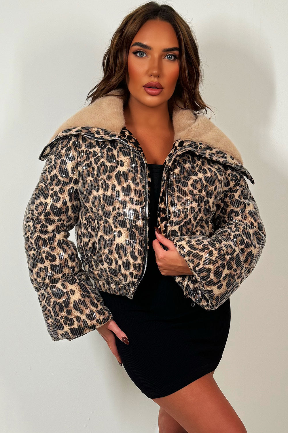 Faux fur collar leopard print puffer jacket with sequin detail. This leopard print puffer jacket is going to inject boldness into your outerwear wardrobe babe. Featuring leopard print puffer jacket with faux fur collar zip fastening long sleeves wind proof pockets and all over sequin detail outside. Perfect fur collar jacket to go with any outfit of your choice. This faux fur collar puffer jacket in leopard print is of premium quality.