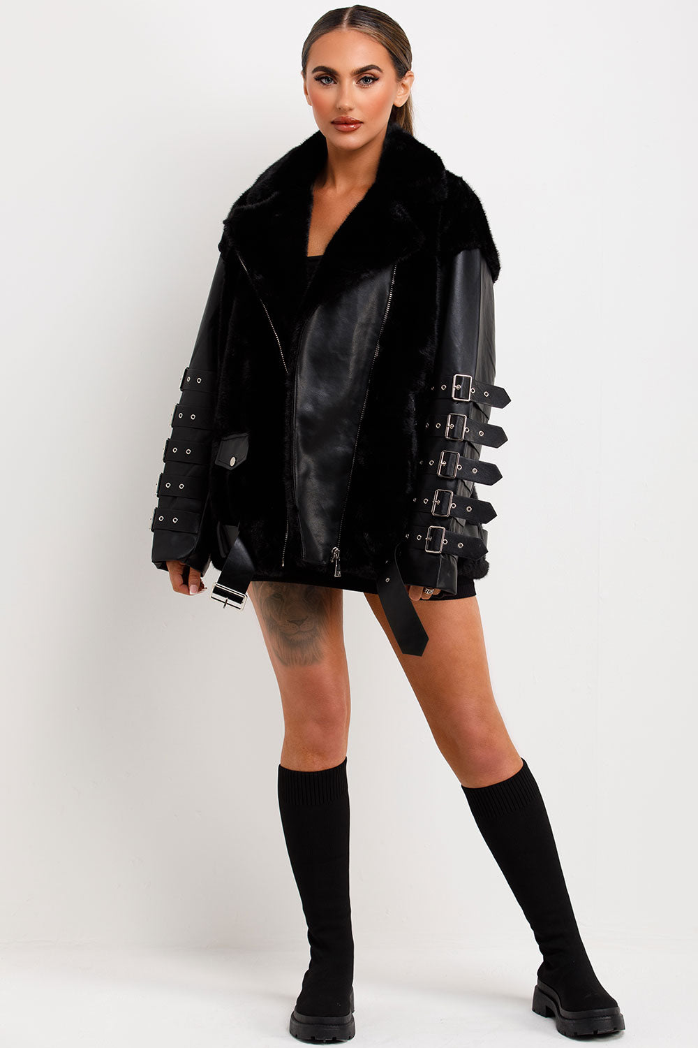 Faux Fur Faux Leather Aviator Jacket With Strap Sleeve Detail Black