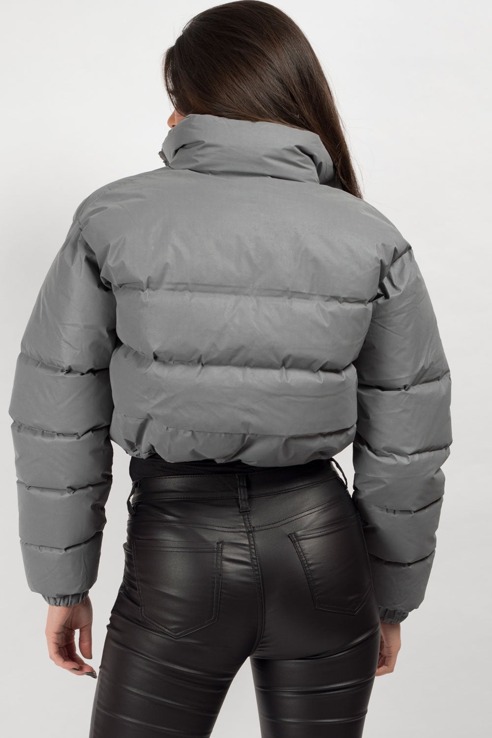 Reflective jackets are becoming must have for your AW wardrobe. This reflective puffer jacket features cropped length, highly reflective grey fabric, zip fastening and drawstrings. Style it with our high waist jeans or with a dress for your next party. Also available in BLACK.