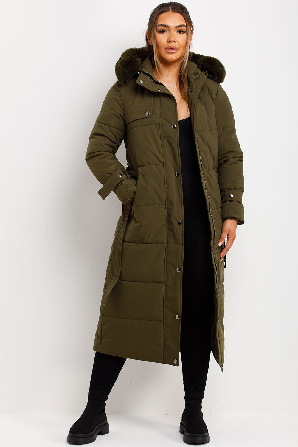 Long Puffer Trench Coat With Belt And Faux Fur Hood Khaki