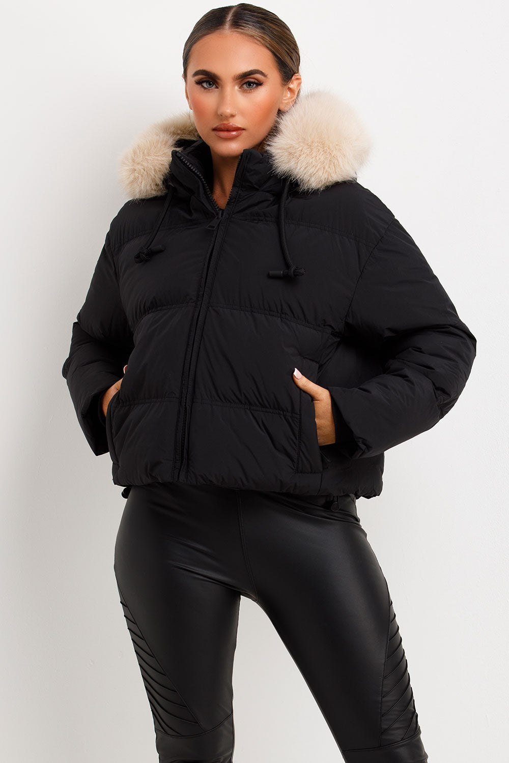Puffer jacket with fur hood. This fur hood jacket is sure to be perfect addition for your outerwear wardrobe. Featuring faux fur hood puffer jacket with zip fastening pockets drawstring hem extremely warm wind proof padded weather resistant and premium quality. This fur hood puffer jacket is perfect to complete you new season look. This puffer jacket with faux fur hood is also available in other colours.