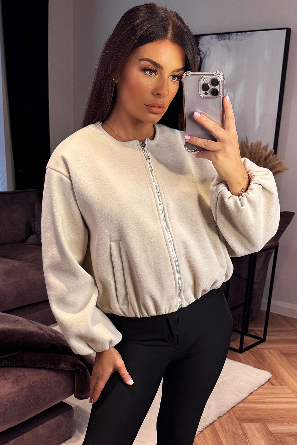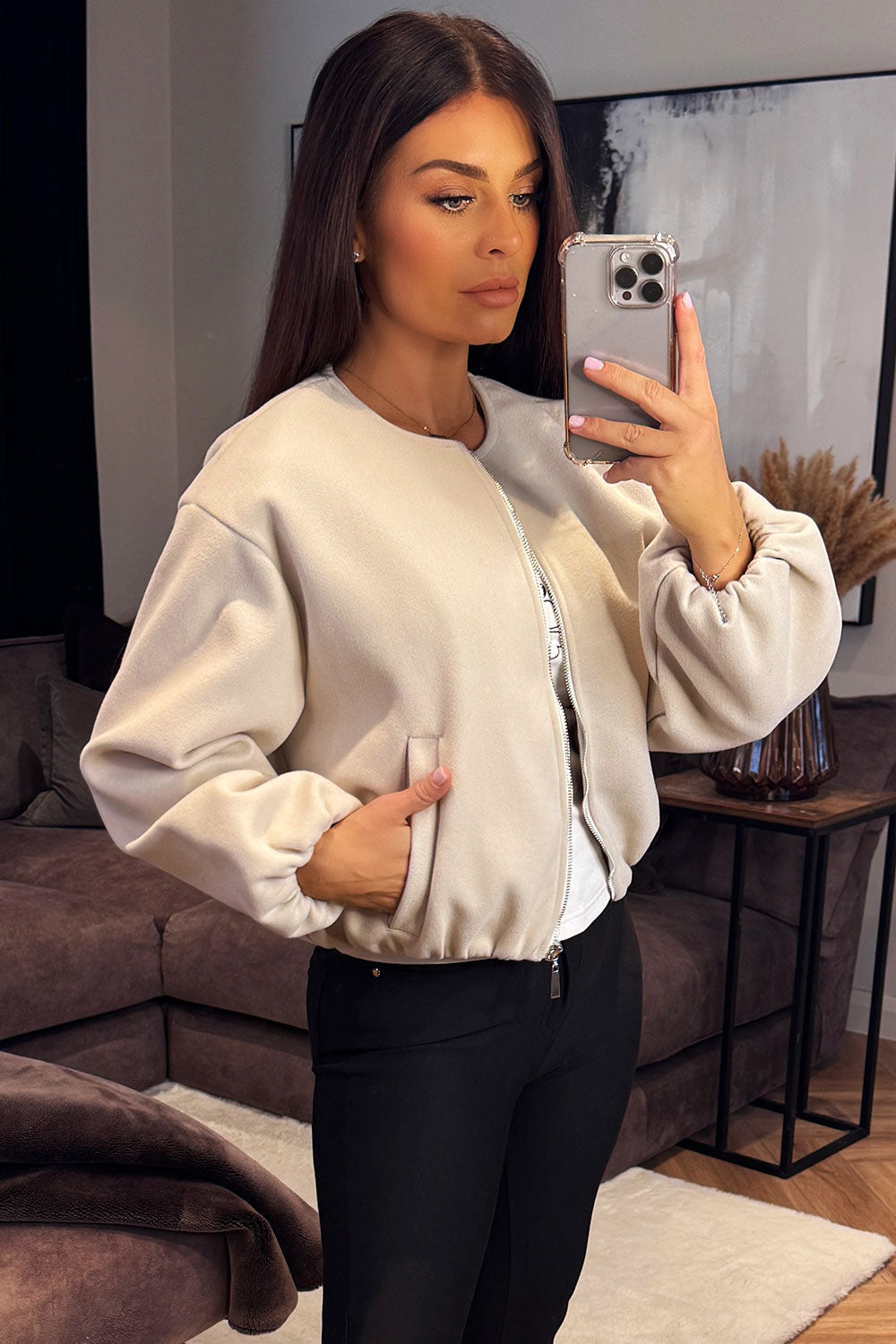 Soft bomber jacket. This bomber jacket is a must have for your new season outerwear wardrobe. Featuring soft bomber jacket with round neck elastic cuffs long sleeves pockets on front elasticated hem and zip up front. Style this bomber jacket with any outfit to complete the look we are loving. This soft bomber jacket is also available in other colours.