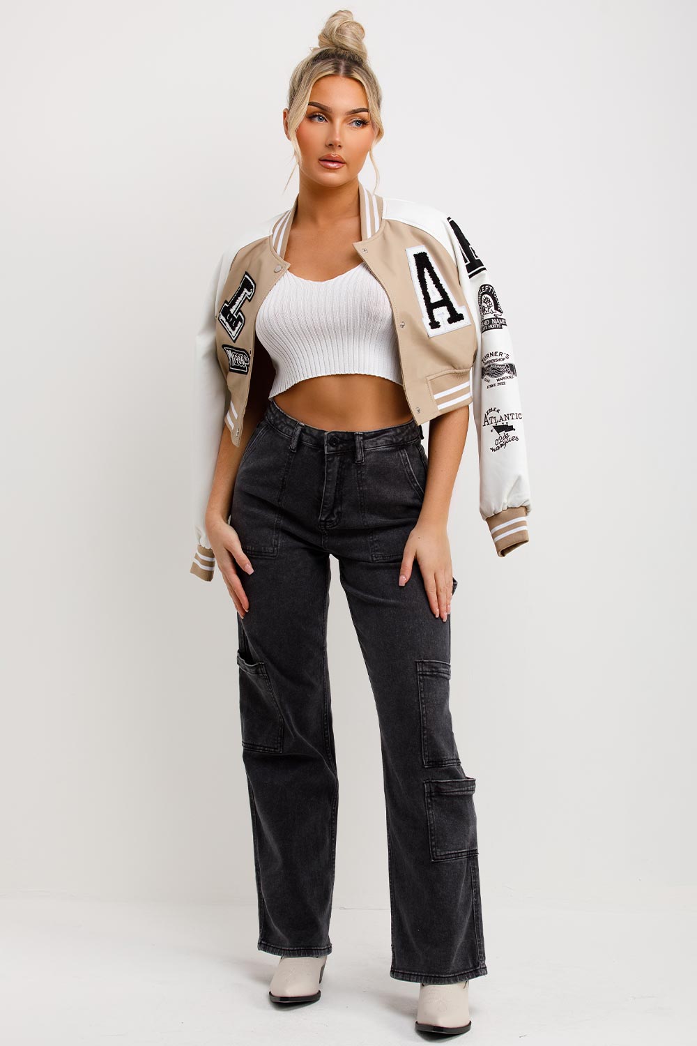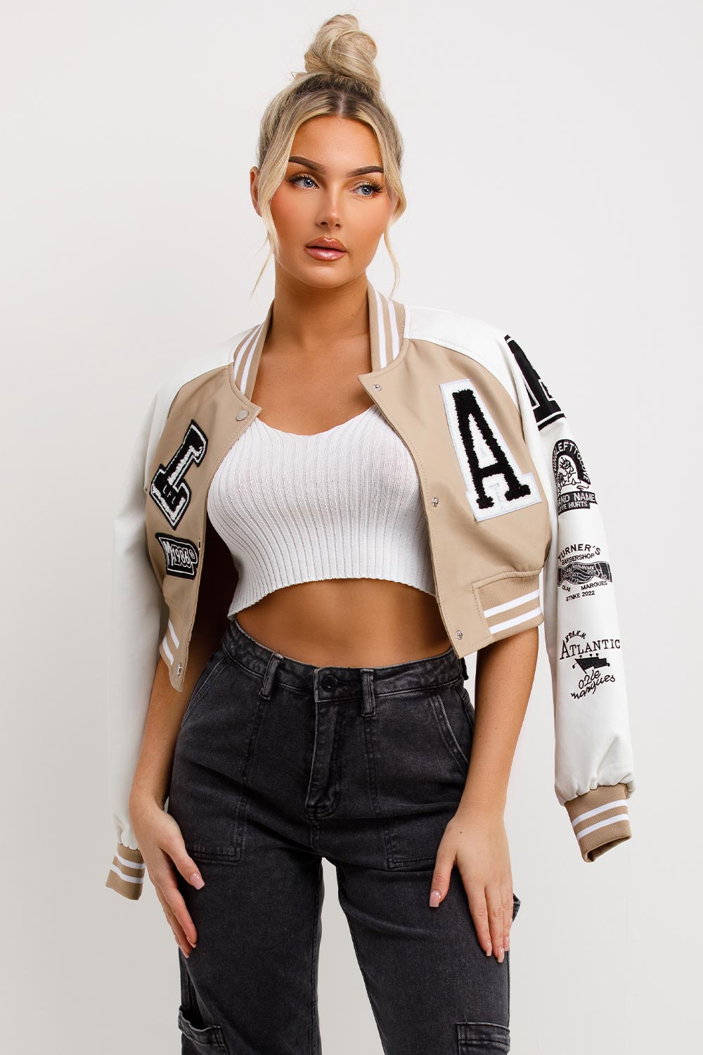 Varsity Bomber Faux Leather Jacket With Letter Detail Beige