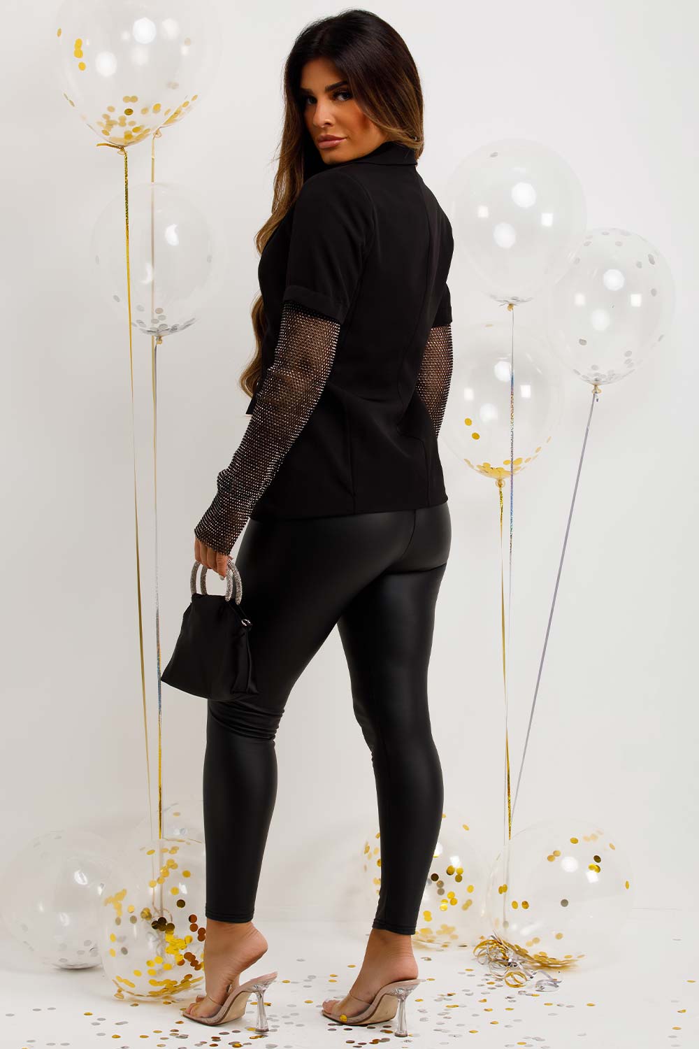 Blazer with diamante net sleeve. This blazer jacket is going to take your look to the next level effortlessly. Featuring blazer jacket with diamante net chainmail sleeve detail. Style this diamante sleeve blazer with our leather look leggings to complete the outstanding looks. This blazer jacket is also available in other colours.