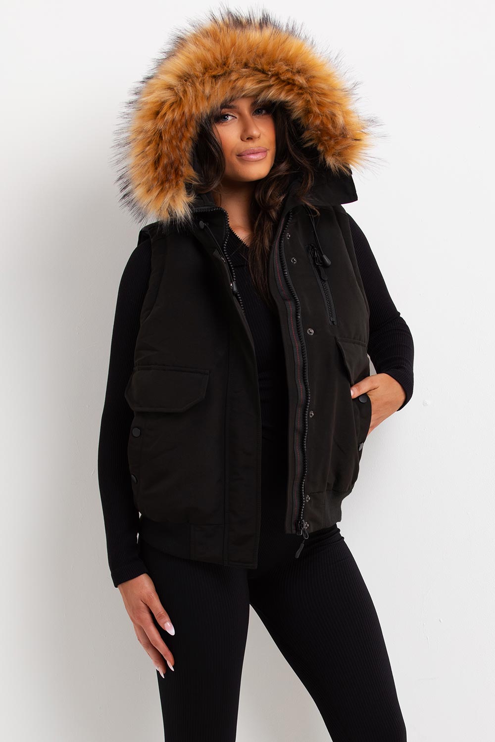 Black gilet with faux fur hood. This fur hood gilet is going to keep you cosy comfortable and all styledup in this new season. Featuring premium quality thick gilet body warmer with pockets big white faux fur hood weather resistant and extremely warm. Layer this gilet on top of any outfit to complete the chilled new season look. This faux fur hood gilet is perfect outdoors all year around.
