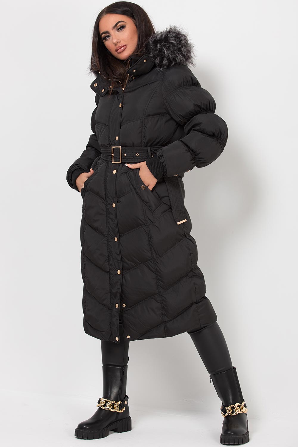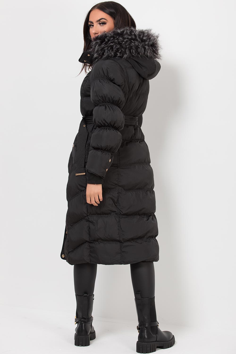Long puffer padded coat with fur hood and belt. This puffer coat is a must have for your outdoor wardrobe. This long padded puffer coat features hood with faux fur trim extremely warm weather resistant zip stud fastening and adjustable waist belt. Style it with our leather look leggings to complete the look we are loving. Also available in Grey.
