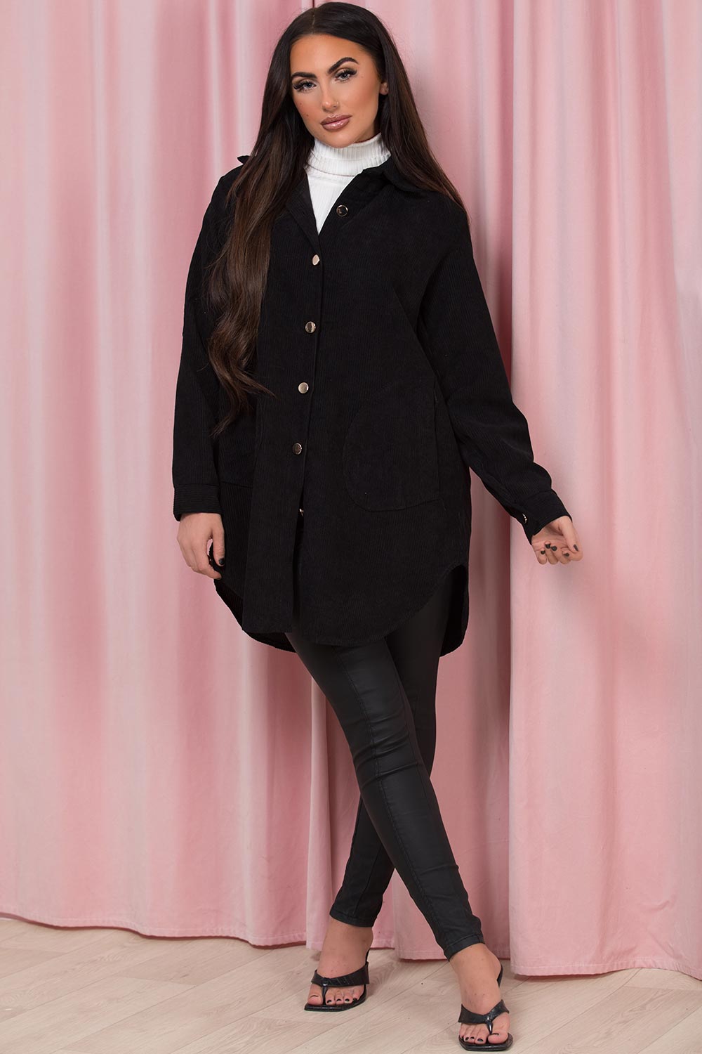 Oversized cord shacket jacket. Add this cord shacket into your new season wardrobe for cool casual look. This oversized shacket features cord fabric wth button fastening and pockets. Style it with our leather look trousers and chunky boots to complete the look. Also available in other colours.