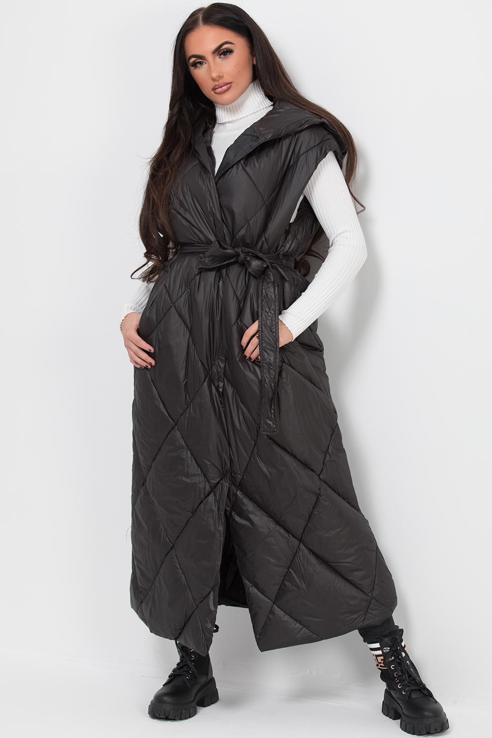 Black puffer quilted gilet with hood. This black gilet is perfect to go on top of any outfit. This long gilet bodywarmer features quilted oversized fit with button and waist belt fastening. Style it with our roll neck top and leather look leggings to complete the look.