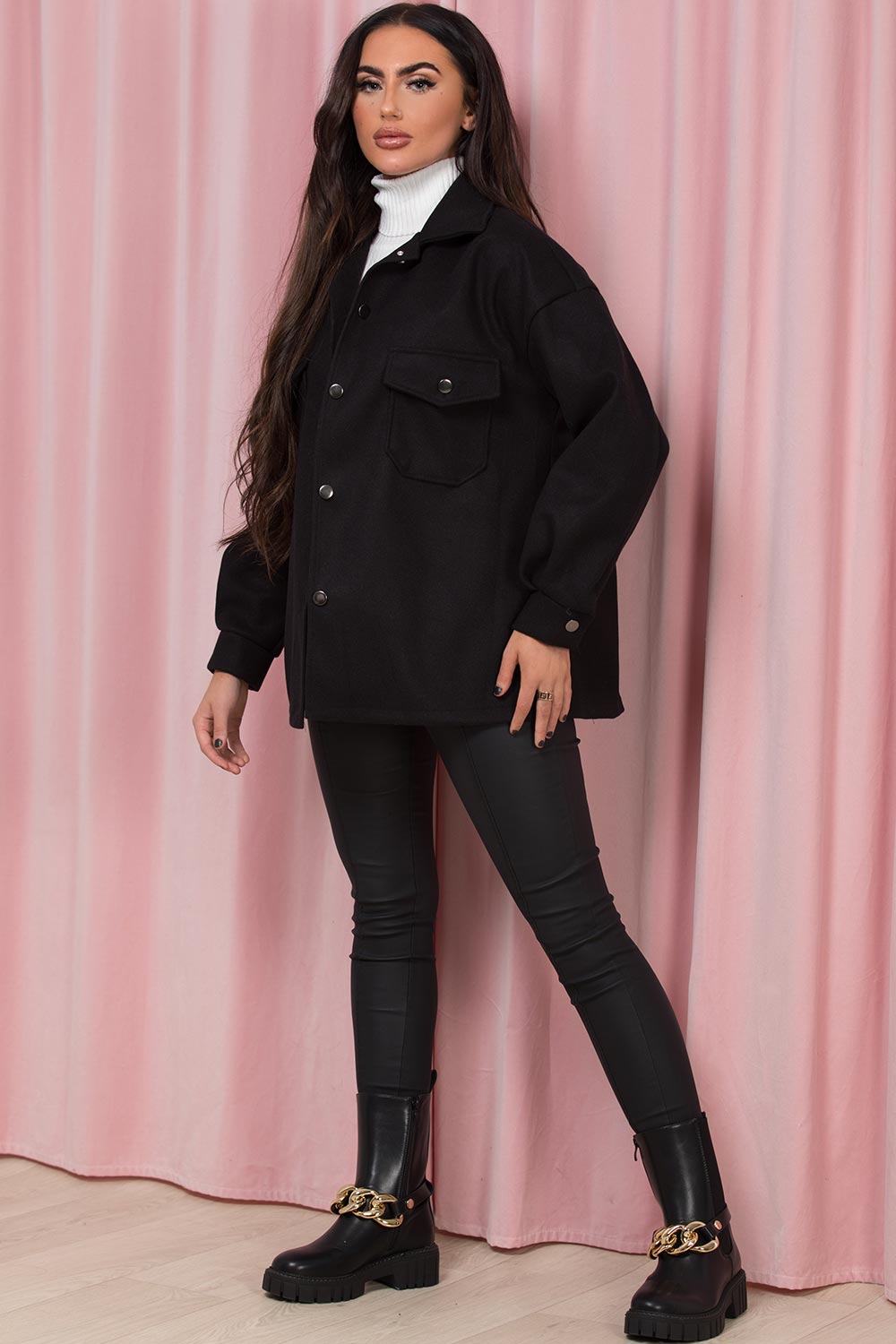 Black shacket with double pockets. This oversized shacket is a must have for your new season collection babe. Featuring thick brushed fabric, button fastening, long sleeves and pocket front. Wear it with our high waisted leather look leggings to complete the cool casual look. Also available in other colours.