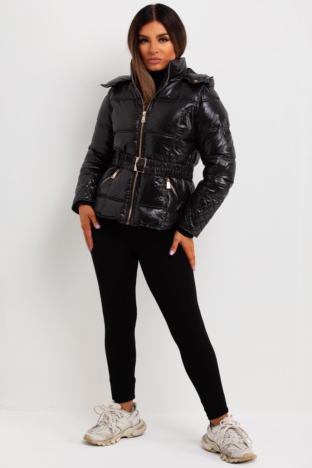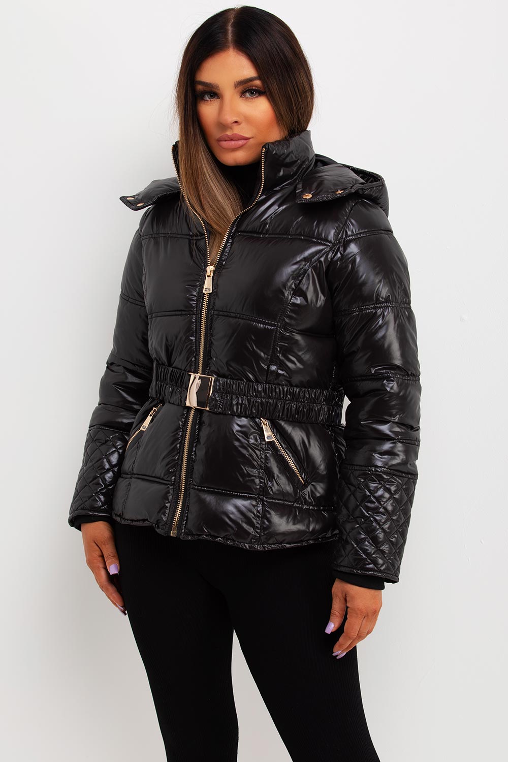 Shiny puffer jacket. This puffer jacket is sure to keep your outerwear game on point. This black puffer jacket features soft shiny fabric padded puffer quilted style hood and waist belt pockets weather resistant and wind proof. Perfect new season hooded jacket. Style this puffer jacket with matching outfit to complete the look we are loving.