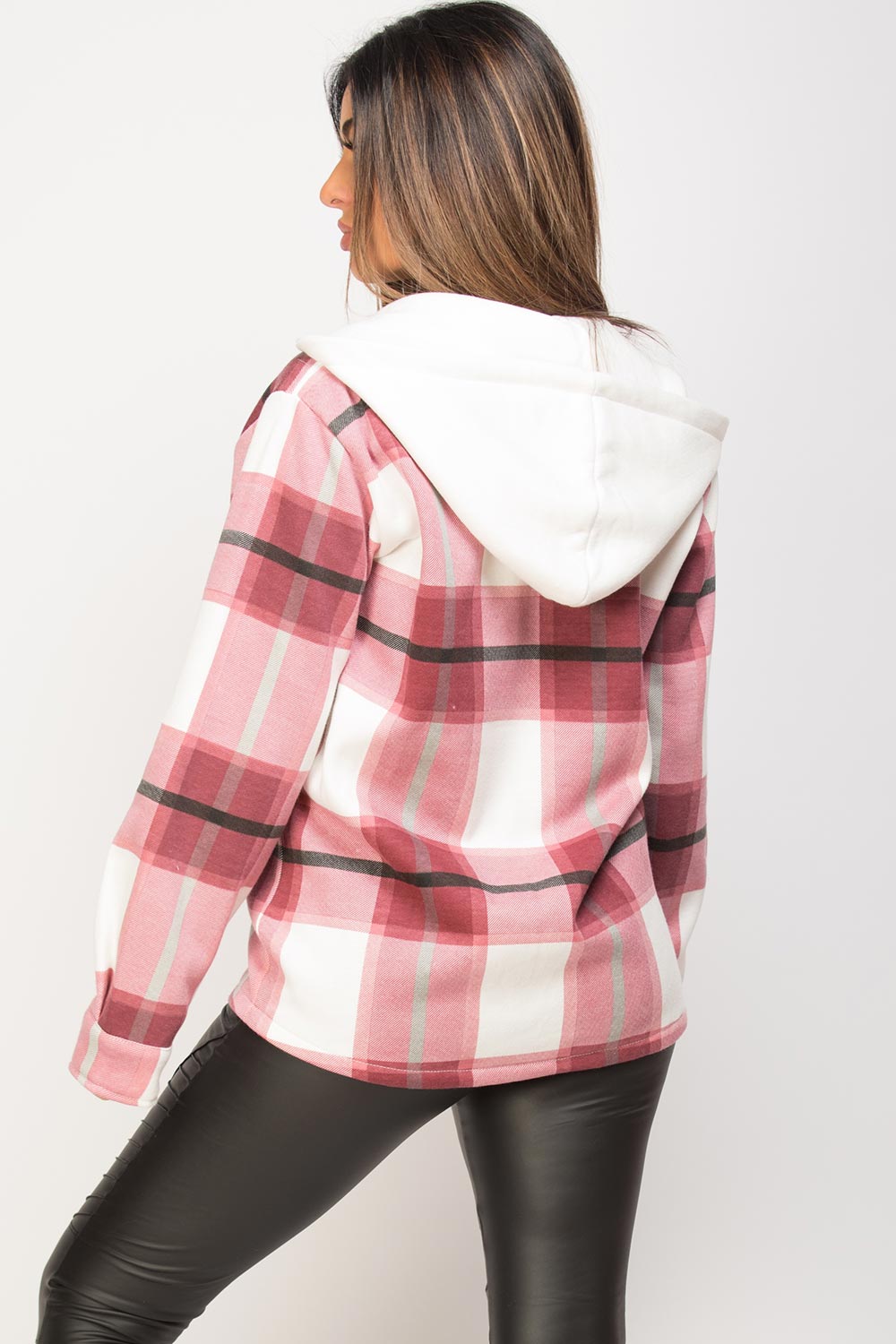 Check hooded shacket in wine red oversized fit, zip fastening, pockets and contrast hood with drawstrings. Style it with our distressed high waisted jeans and sock boots to complete the look we are loving. Also available in other colours.