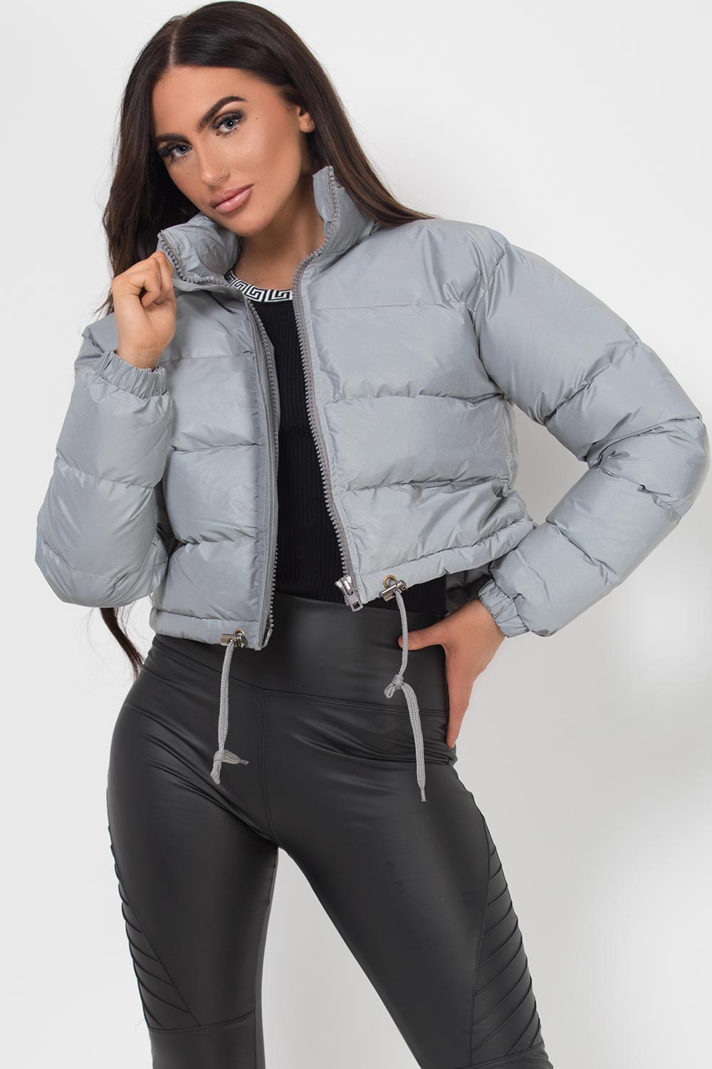 Crop puffer jacket in reflective grey. This crop padded jacket is perfect to be added with any outfit all year around. Featuring reflective fabric, padded puffer style, zip fastening and drawstring waist. Style it with our high waisted ripped jeans to complete the look. Also available in Black.